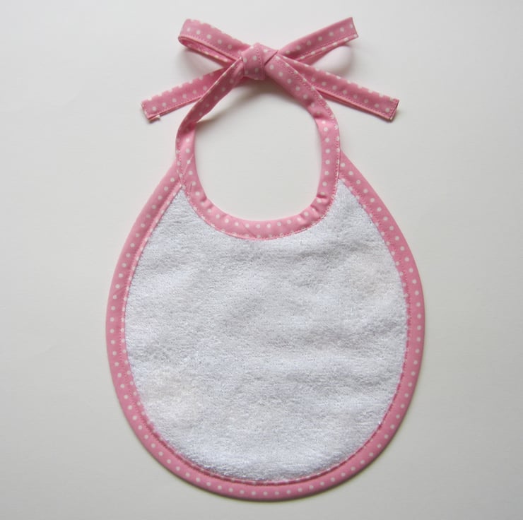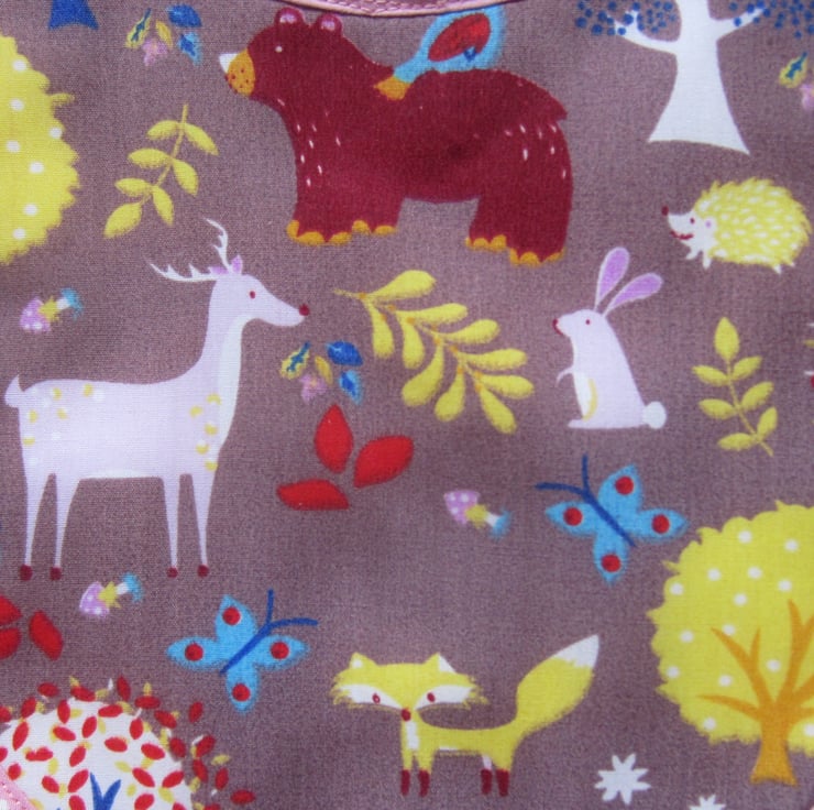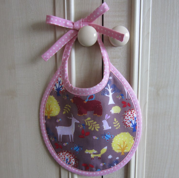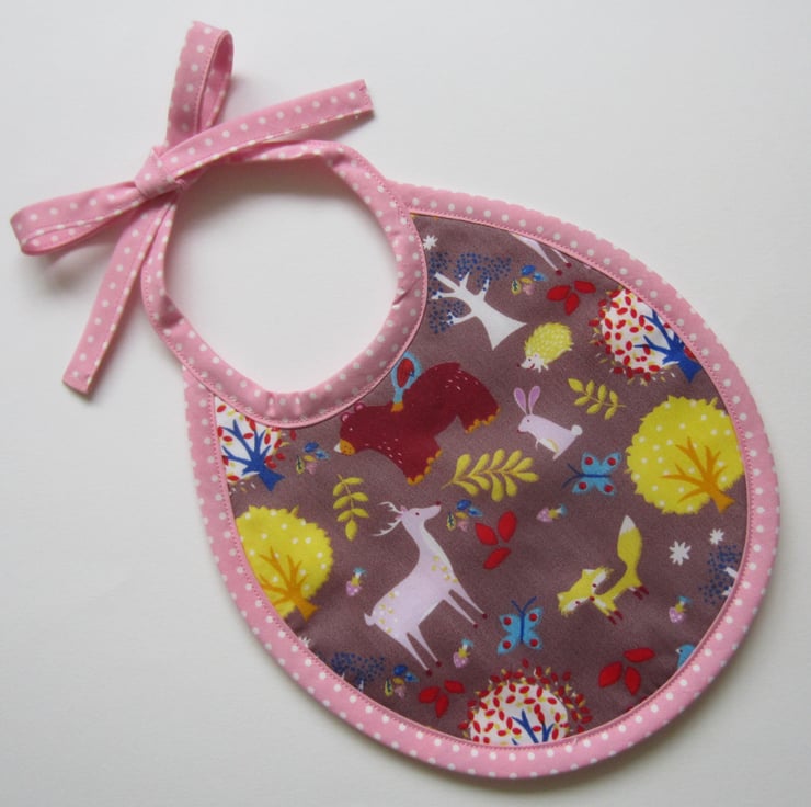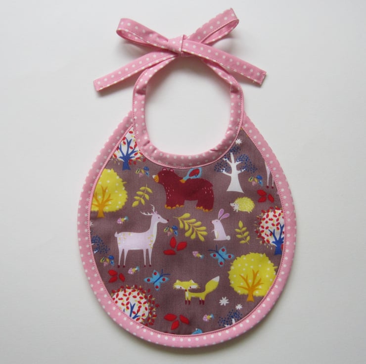 First size baby bib in a woodland animal fabric with a fox, deer, bear, rabbit, hedgehog and trees. It is edged in a pink and white spotty bias binding and backed with white towelling for extra protection.