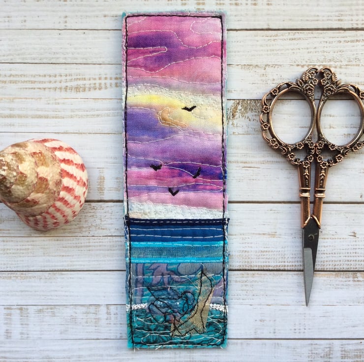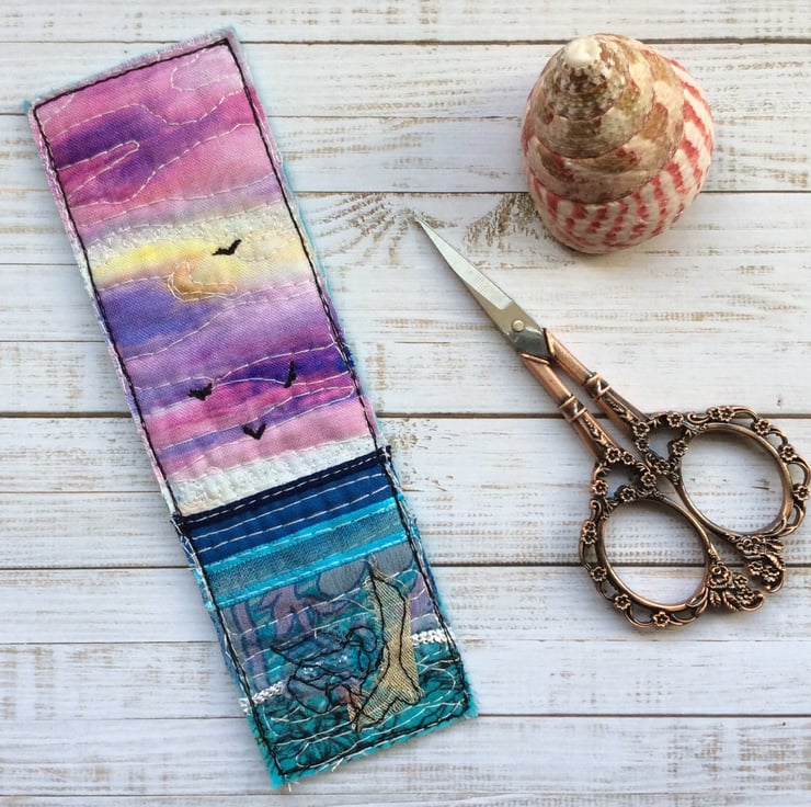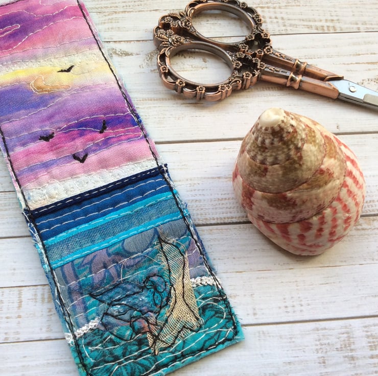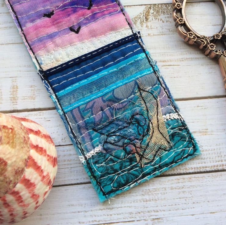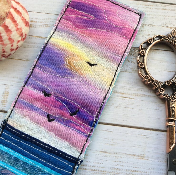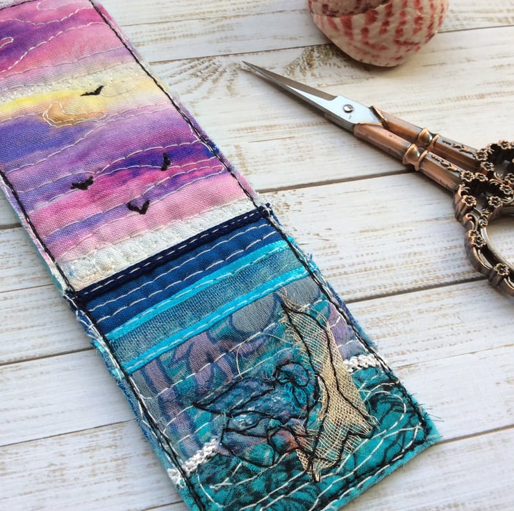 This embroidered sunset seascape bookmark is made with layered up-cycled and recycled silk and enhanced with ribbons and free motion embroidery. The bookmark measures 5 x 16cm.