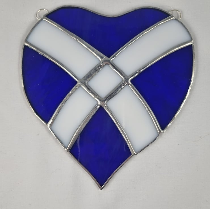 The Saltire is a white glass cross on a blue glass background in the shape oh a heart. two rings and invisible thread are used to hang it.