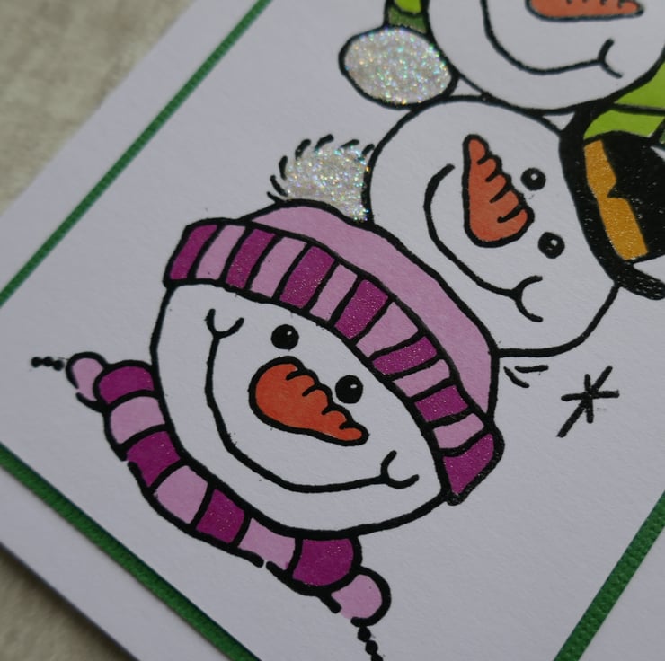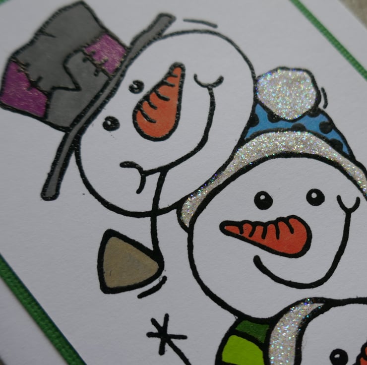 The 'Snow Buddies' have been stamped onto a piece of white matt card using black ink and the outlines have been embossed to make them shine. The panel has been layered onto green card . The snowmen's scarves and hats have been coloured and highlighted with a shimmer pen and glitter glue added to the trim and bobbles on the hats.