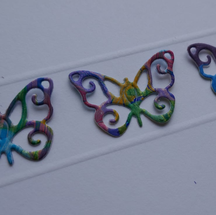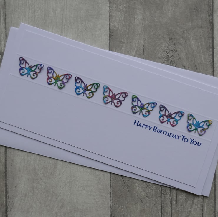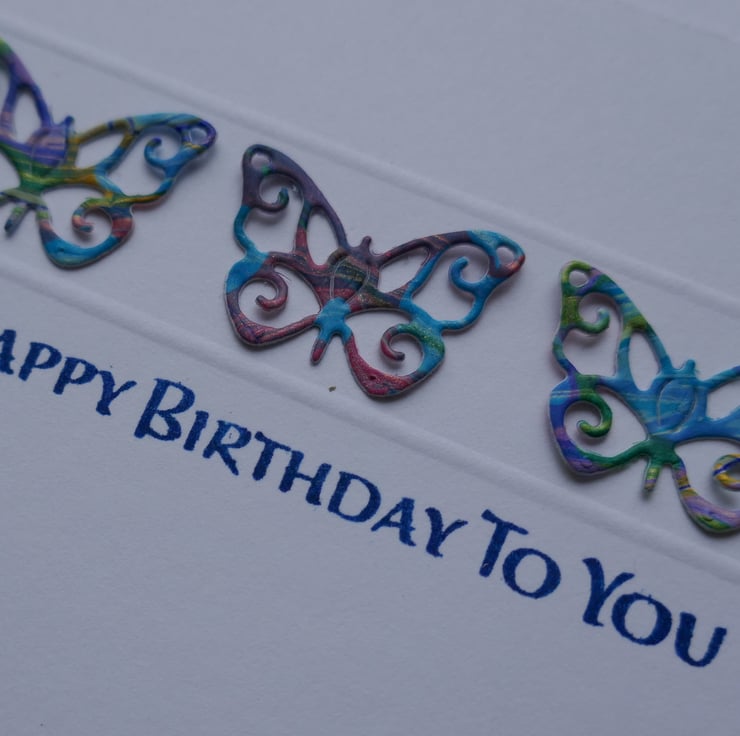 A piece of white card has been attached to the front, across which are two embossed lines and seven bright butterflies in shades of pink, purple, green, turquoise and gold. These have been die cut from a beautiful marbled paper from The Whimsical Marbler. The sentiment 'Happy Birthday To You' has been stamped in dark turquoise ink below the butterflies.