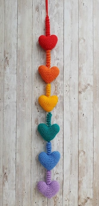 I knitted a rainbow heart window display for our home last April and loved it so much I have left it hanging in my porch. Then I learned to crochet in December and crocheting hearts is SO much quicker than knitting them. So I crocheted another one and made a few tweaks and improvements.