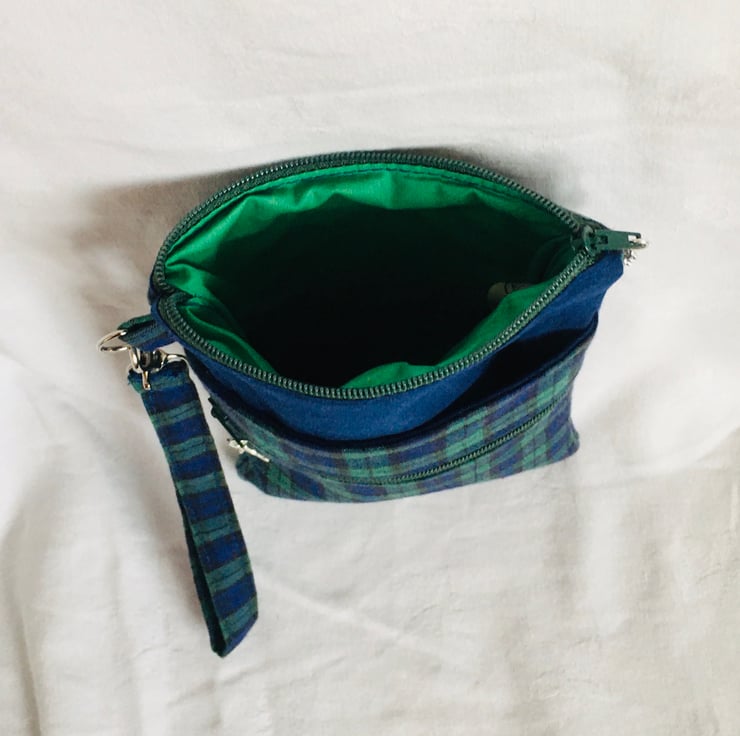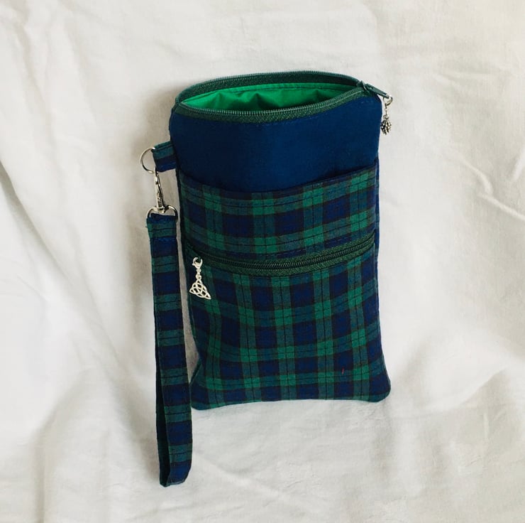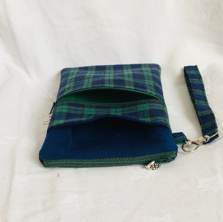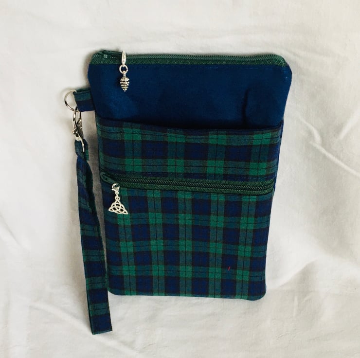 This zip pouch comprises a large zip compartment of the main body, with the addition of two extra pockets on the front, one a slip pocket and an additional zip pocket and finished with a detachable wrist strap. Made in good quality Tartan cotton in Green, Navy and Black and additional plain cotton for part of the main body and lining. Finished with zipper and zip pull charms.
