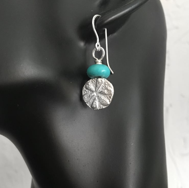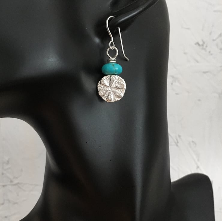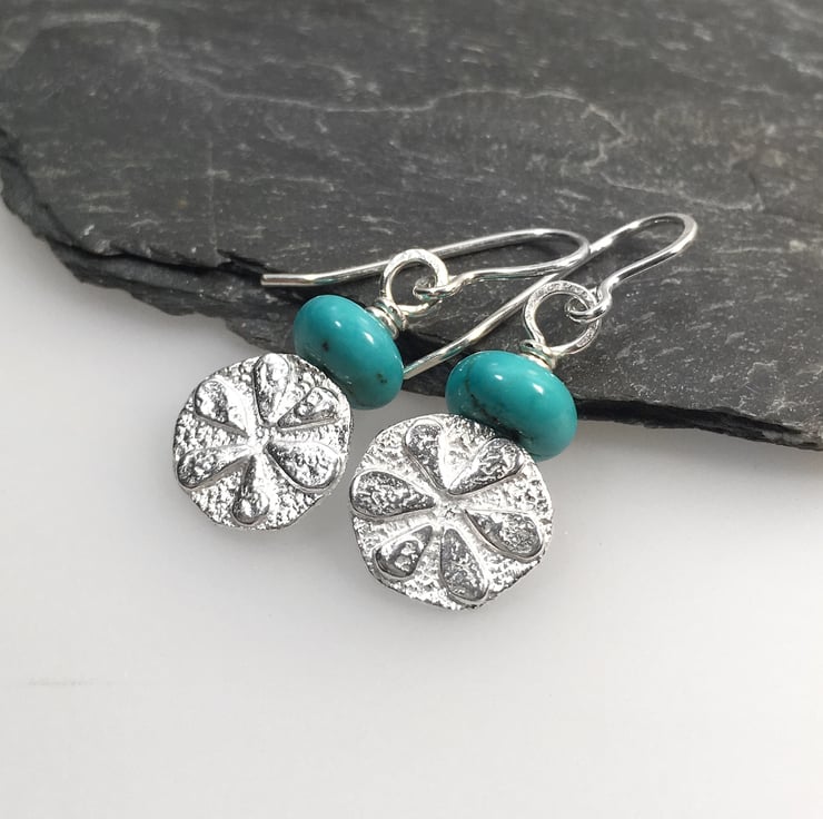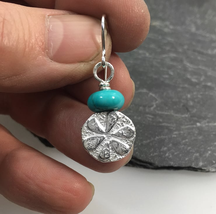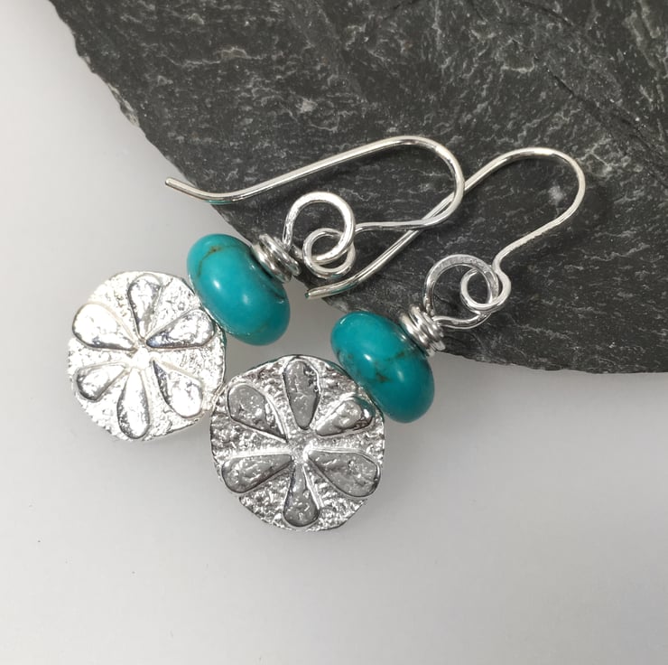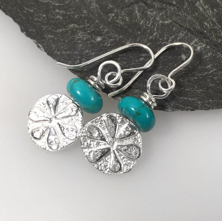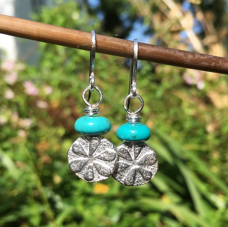 These earrings have sterling silver flower discs topped with turquoise rondelle beads and a wire wrapped loop. They hang from sterling silver hooks.