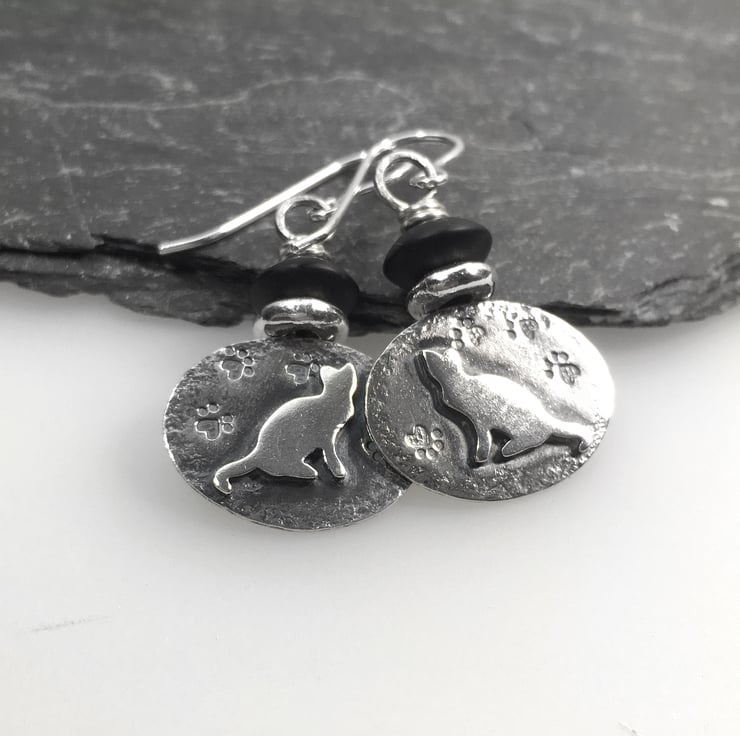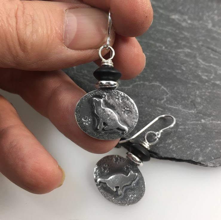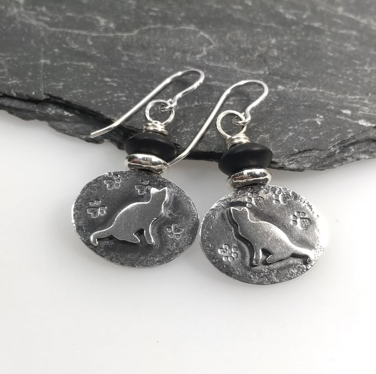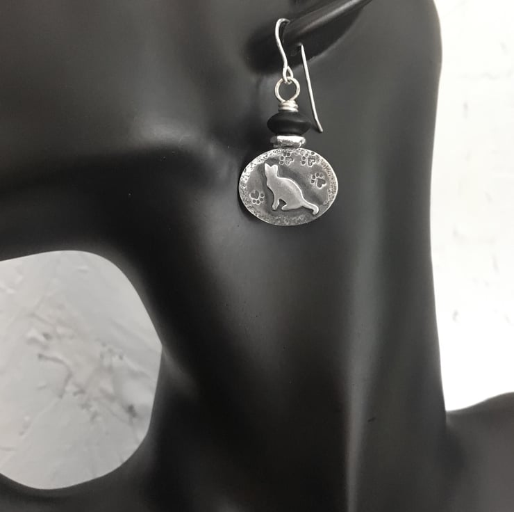 A fun pair of oval earrings with a raised sitting cat silhouette and little stamped paw prints. Topped with small silver and black agate beads and hung from a hand made hooks.