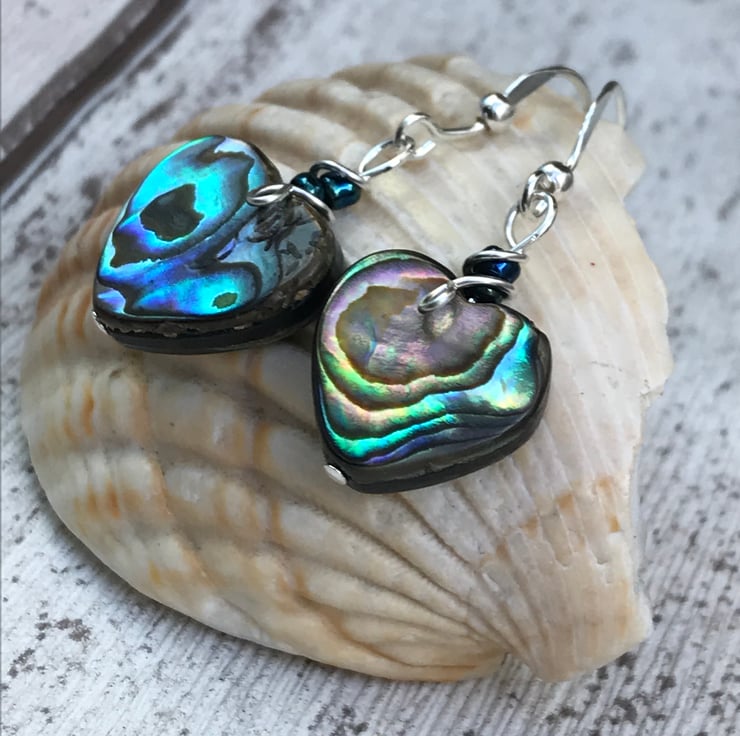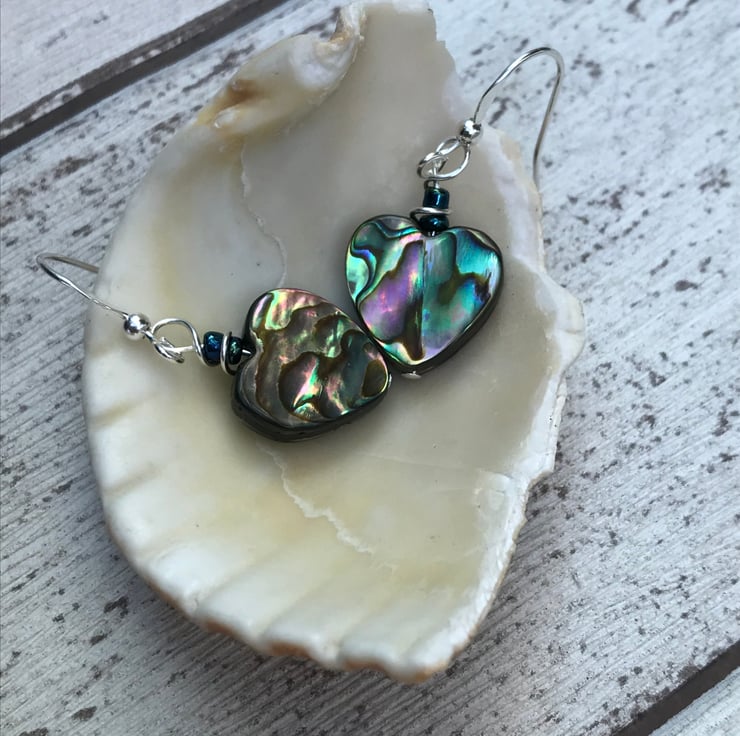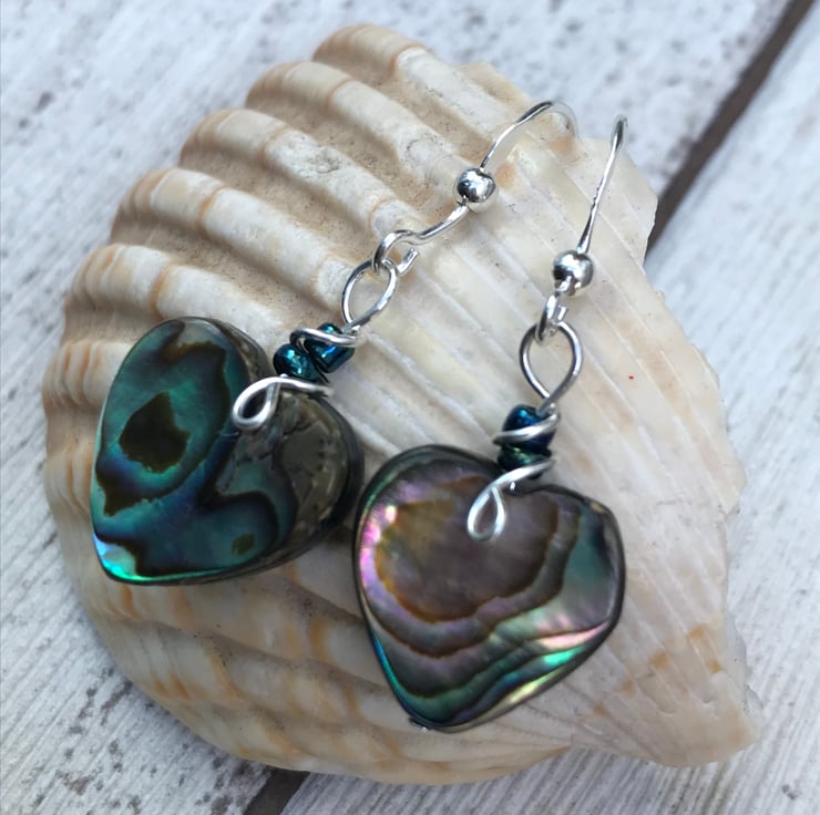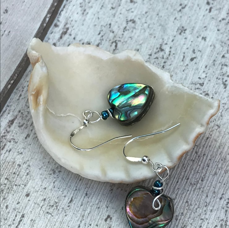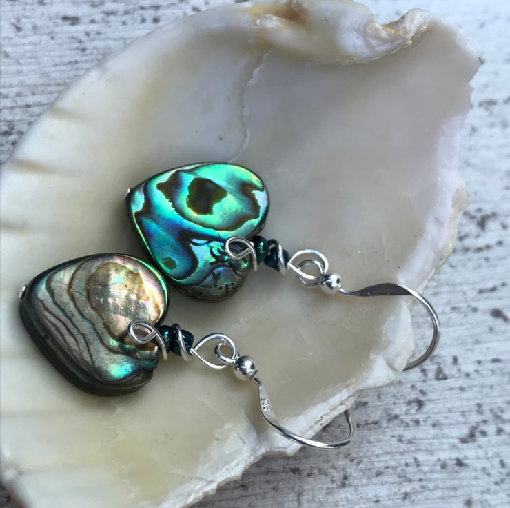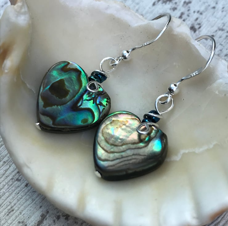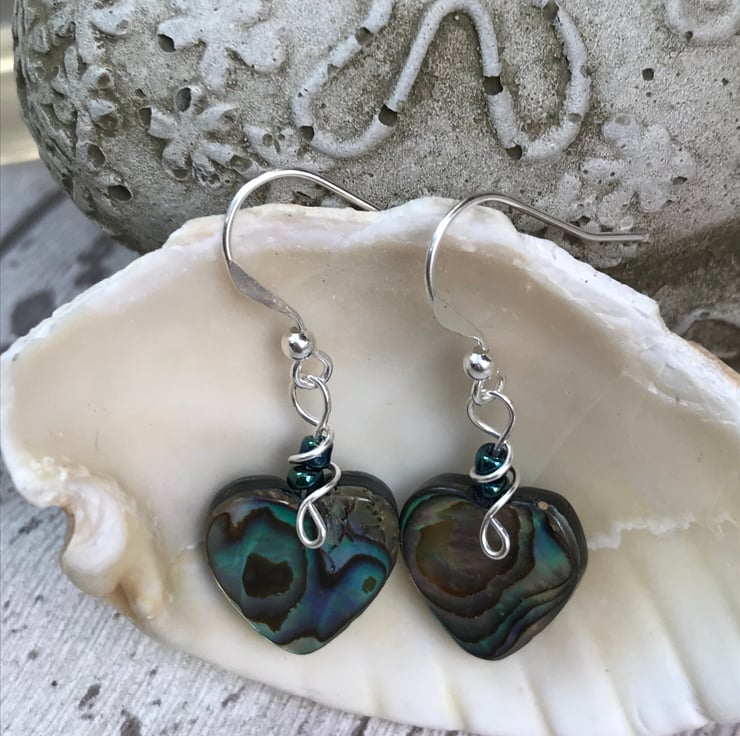 Pretty abalone heart bead earrings with sterling silver ear wires.