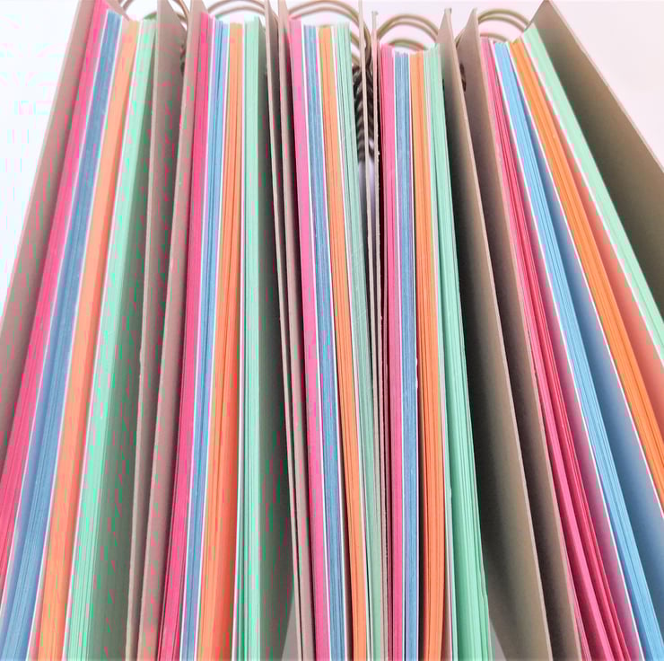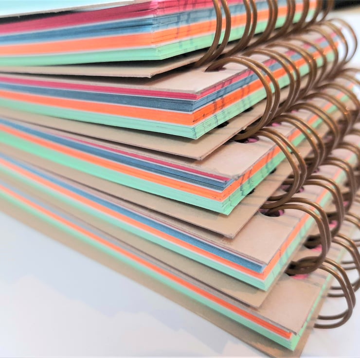A hand made blank, junk journal / notebook containing 4 beautiful colours of paper (80gsm in weight), all neatly bound with a bronze wire and with plain buff card covers.