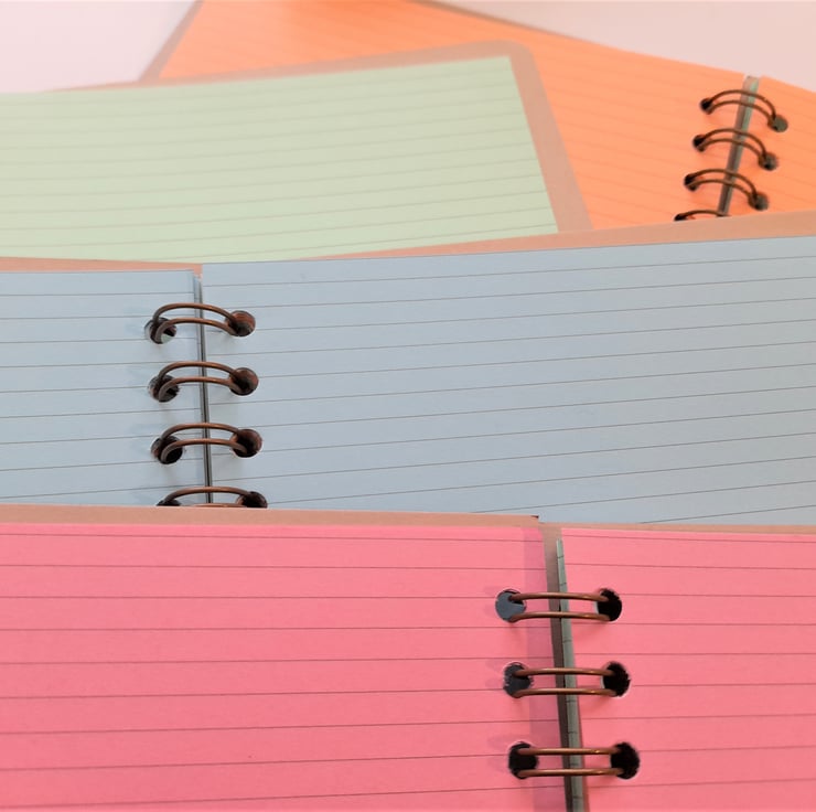 The pages are ruled (5mm spacing), and arranged landscape (with the wire on the short edge). There are 80 sheets of paper (20 of each colour) and the 4 colours are separated with a plain white page.