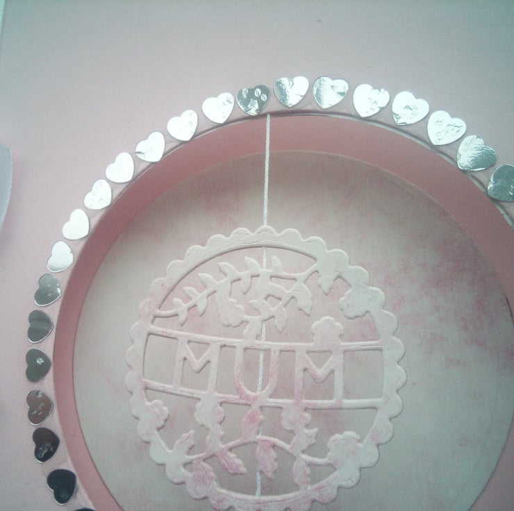 A completely handmade and uniquely designed card. Consisting of quality pink card with a circular aperture cut out from which dangles a pretty mum cut out, double sided so that it can turn around. The circle is surrounded by silver heart sequins. Finished off with a white ribbon and bow