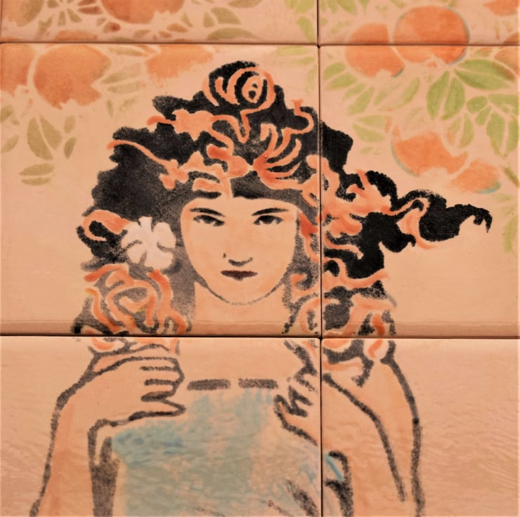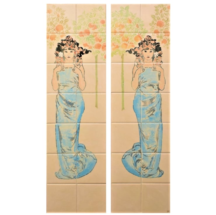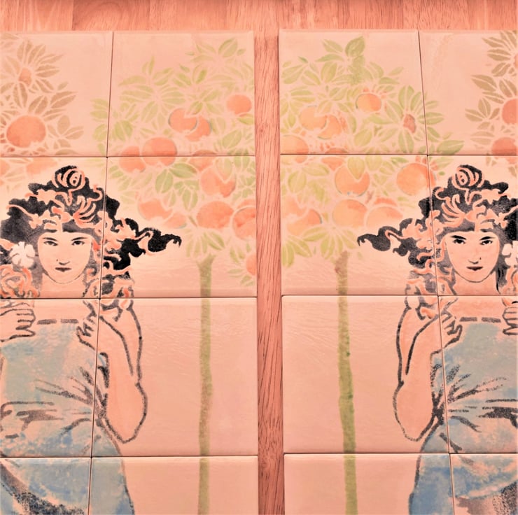 Original hand-painted Fireplace Tiles. Cream background with art nouveau inspired figures and orange trees.