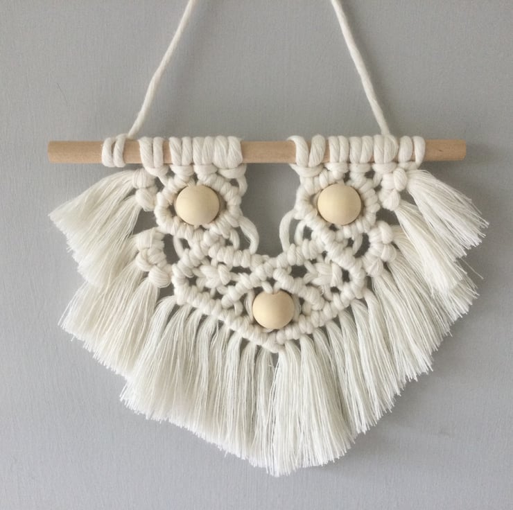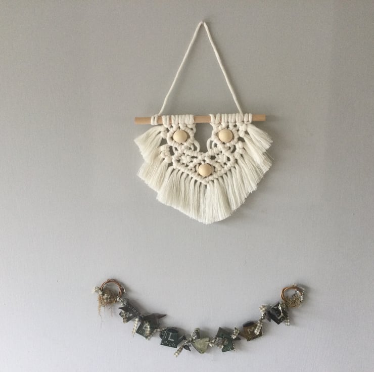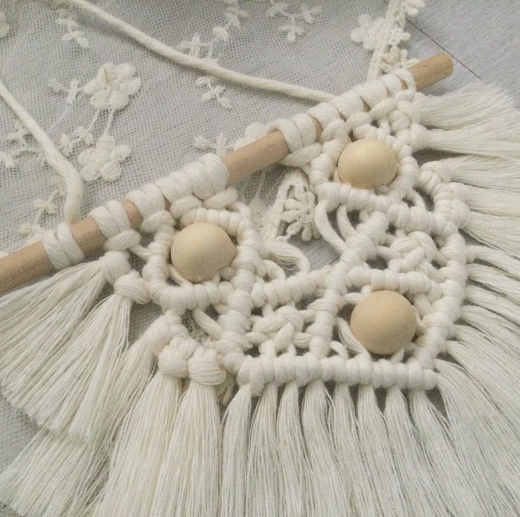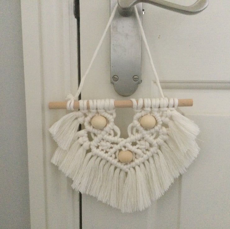Attached to a 7 inch bamboo dowel so an ideal size to pop onto a door handle or peg. I have added some round wooden beads for added interest.
