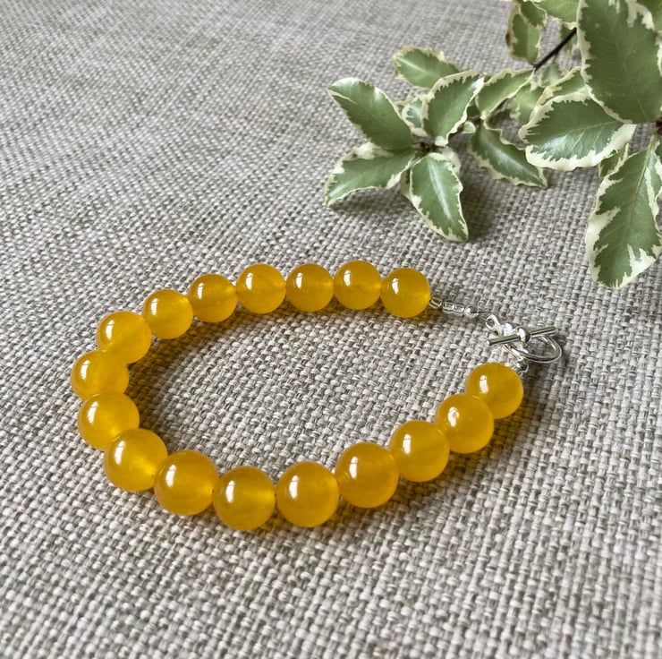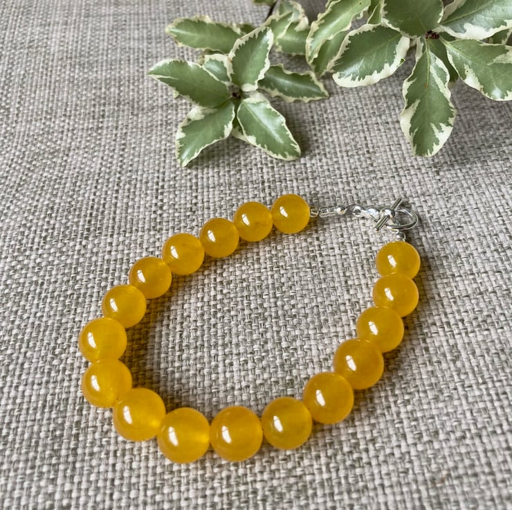 A beautiful bracelet made with bright yellow Quartzite beads (beads are 10mm in diameter), with a silver-plated toggle clasp. The bracelet is approximately 20cm in length (if you would prefer a different length please add a 'note to seller' to your order). A gorgeous bracelet in a beautifully bright colour. Coordinating earrings and necklace are also available.