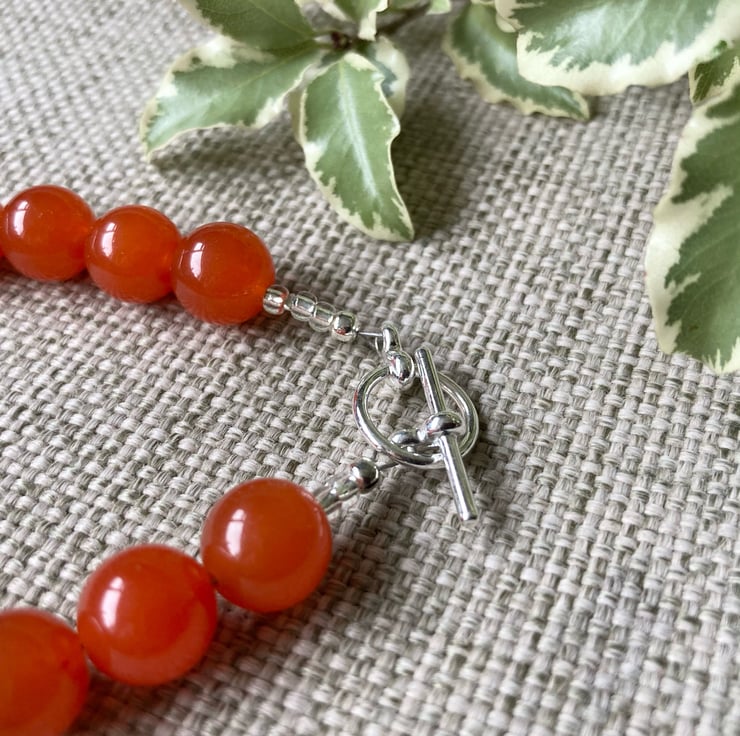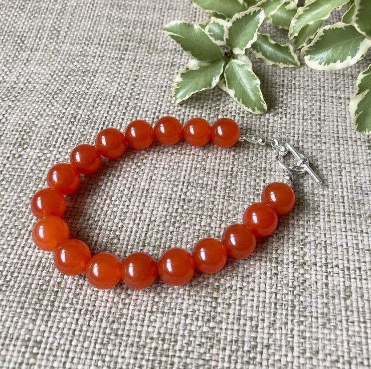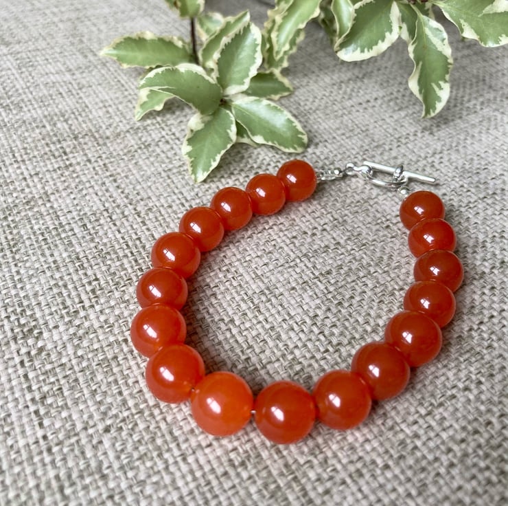 A beautiful bracelet made with orange Quartzite beads (beads are 10mm in diameter), with a silver-plated toggle clasp. The bracelet is approximately 20cm in length (if you would prefer a different length please add a 'note to seller' to your order). A gorgeous bracelet in a beautifully bright colour. Coordinating earrings and necklace are also available.