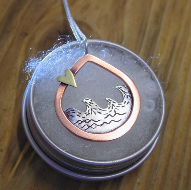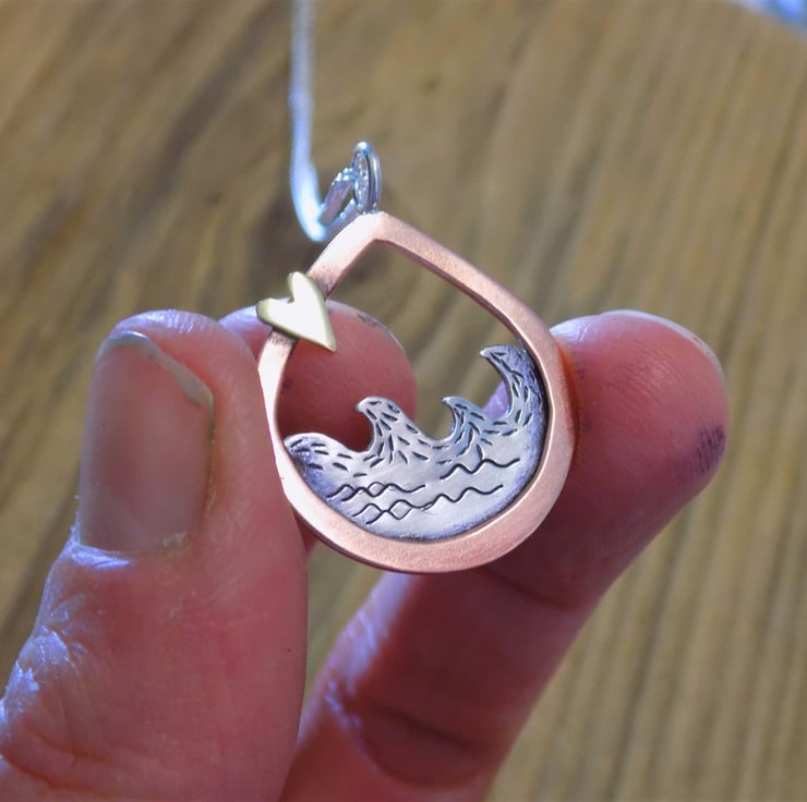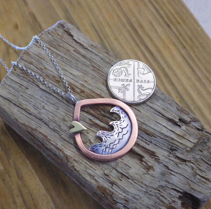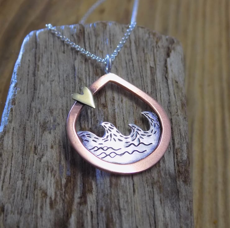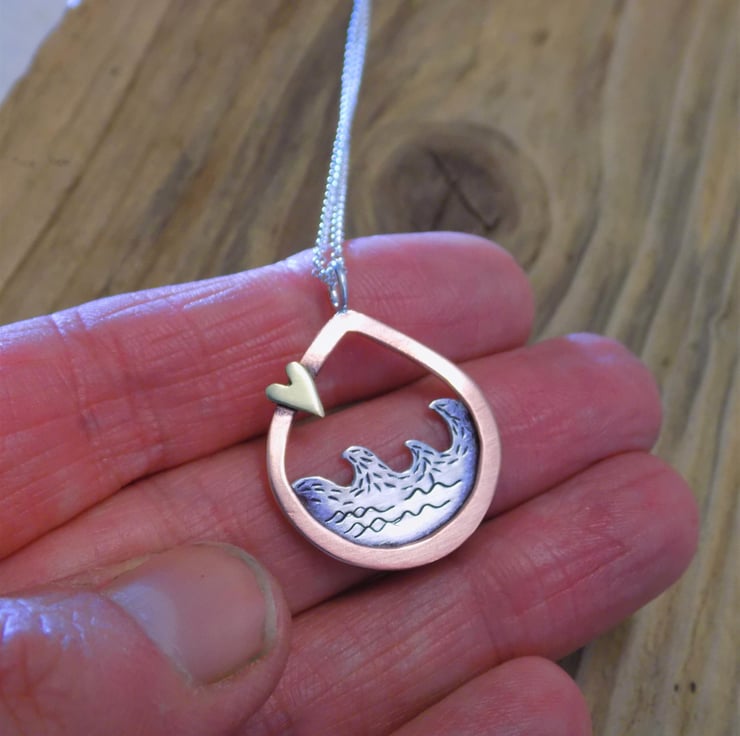 Made from copper and sterling silver. The silver waves sit behind a frame of copper and have been textured to look like the sea, with the addition of a little brass love heart sitting to the left to make it extra special ! . Suspended on a sterling silver 18 " belcher chain.