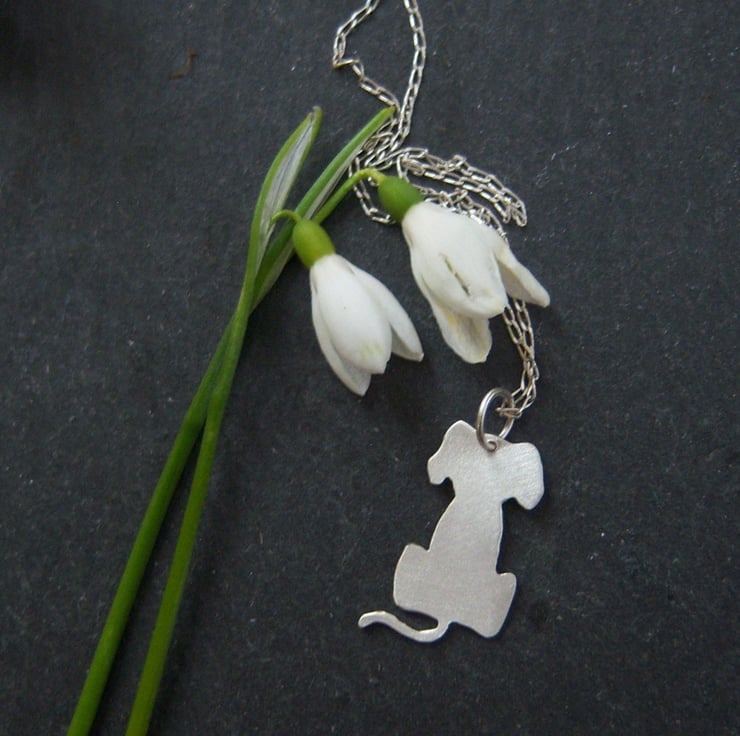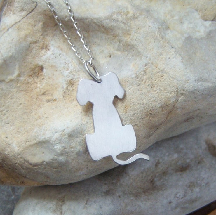 A dinky, lightweight dog cut from sterling silver sheet. Approximately 2cms long. One side shiny, the other side lightly frosted.