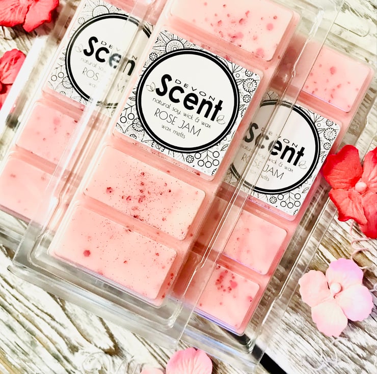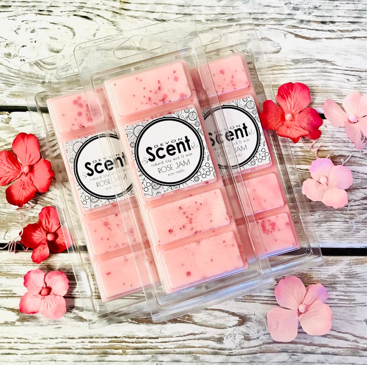 Our highly fragranced long lasting Rose Jam Snap Bar Wax Melts have a strong sweet fruity floral scent that begins with top notes of lemon, apple and pear with a blended heart of rose, geranium, jasmin, strawberry, berry and clove. The fragrance is luscious and similar to a popular scent.