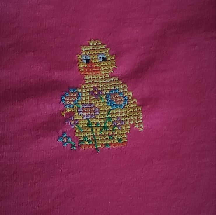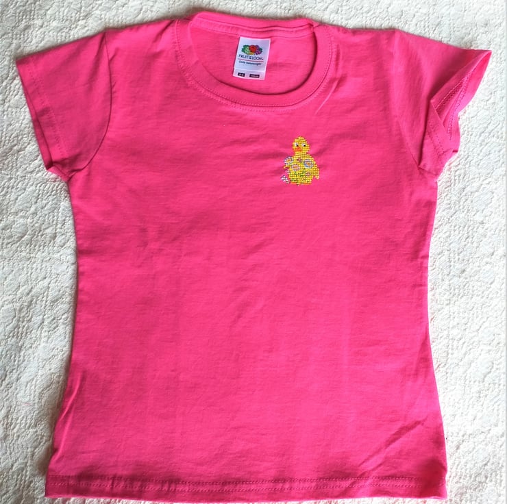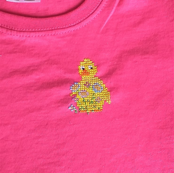 What a lovely Easter gift for a little girl! I have hand embroidered a little yellow duck with a spray of mauve and light blue flowers on a pretty deep pink T-shirt by Fruit of the Loom. As I never use a permanent backing material when hand embroidering kids' clothing, there is nothing inside this shirt to irritate your child's skin. The shirt is slightly fitted, has short sleeves and is 100% cotton. It is fully machine washable.