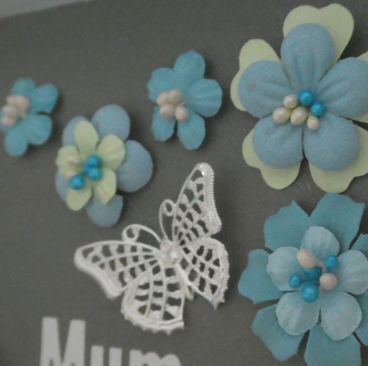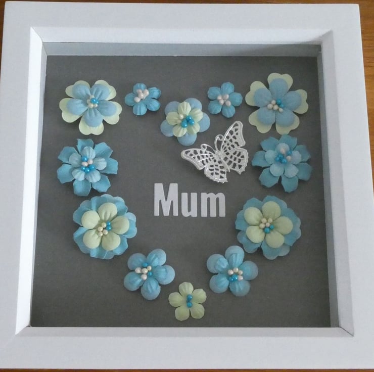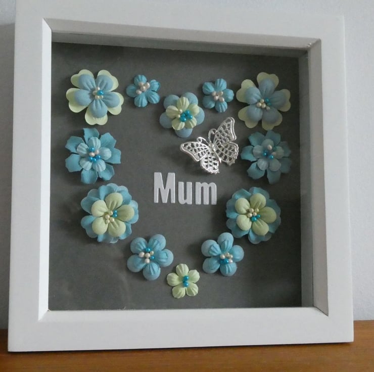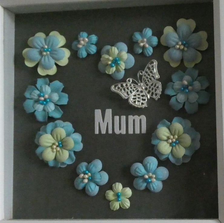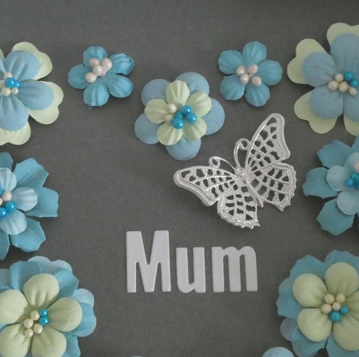 Finished with a silver coloured metal butterfly and the word Mum in white pearlescent card this lovely gift comes complete with a hanging loop on the back. It could also stand on a bookcase or a shelf with a wall behind for support.