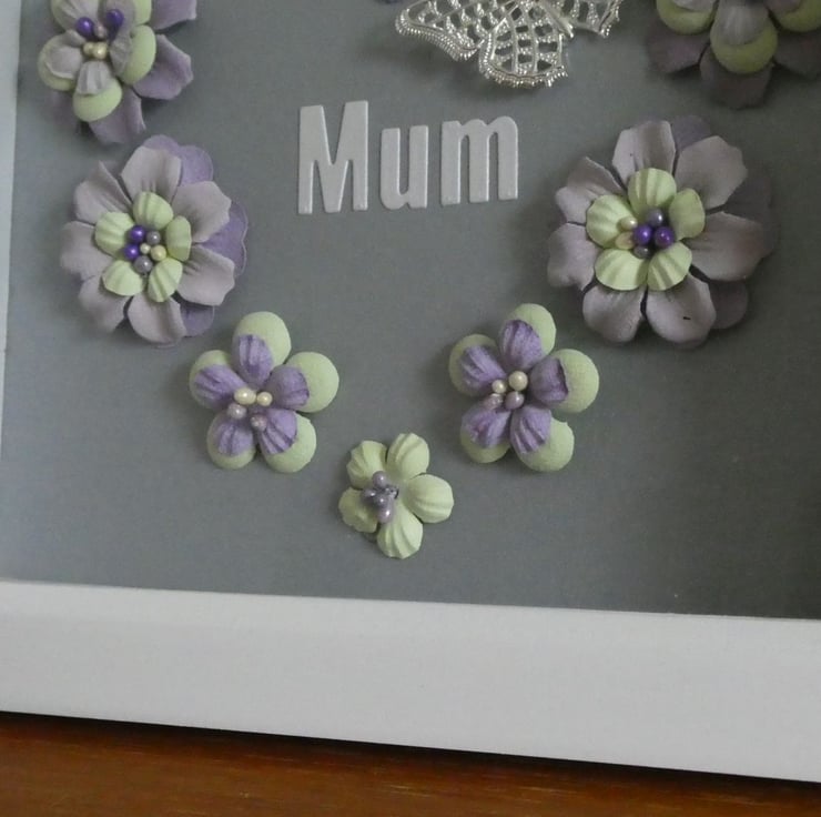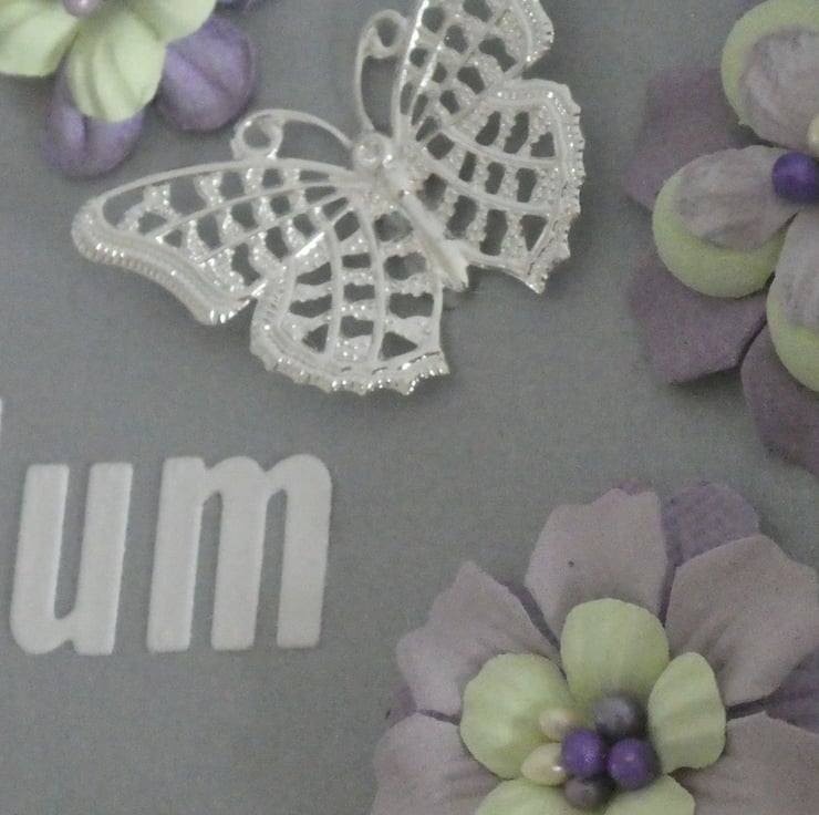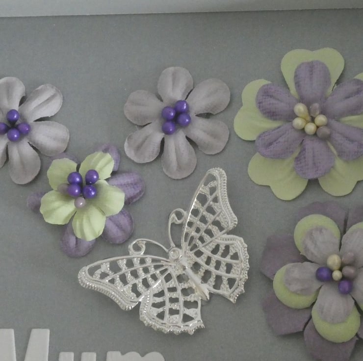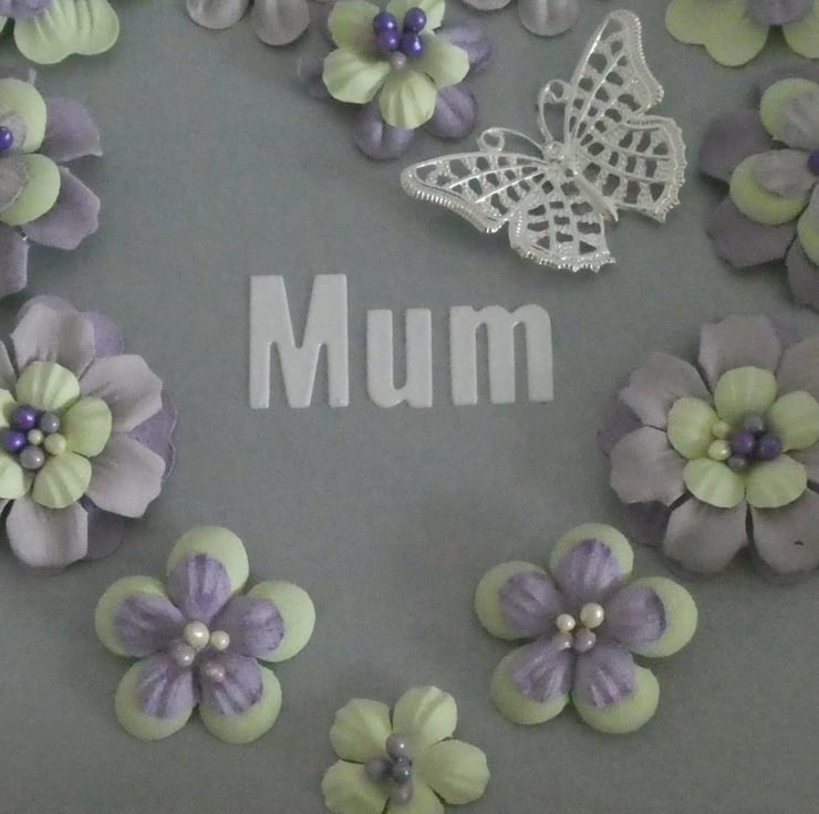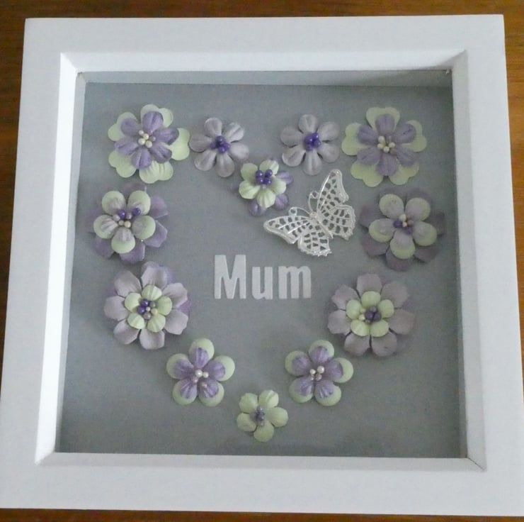 Finished with a silver coloured metal butterfly and the word Mum in white pearlescent card this lovely gift comes complete with a hanging loop on the back. It could also stand on a bookcase or a shelf with a wall behind for support.