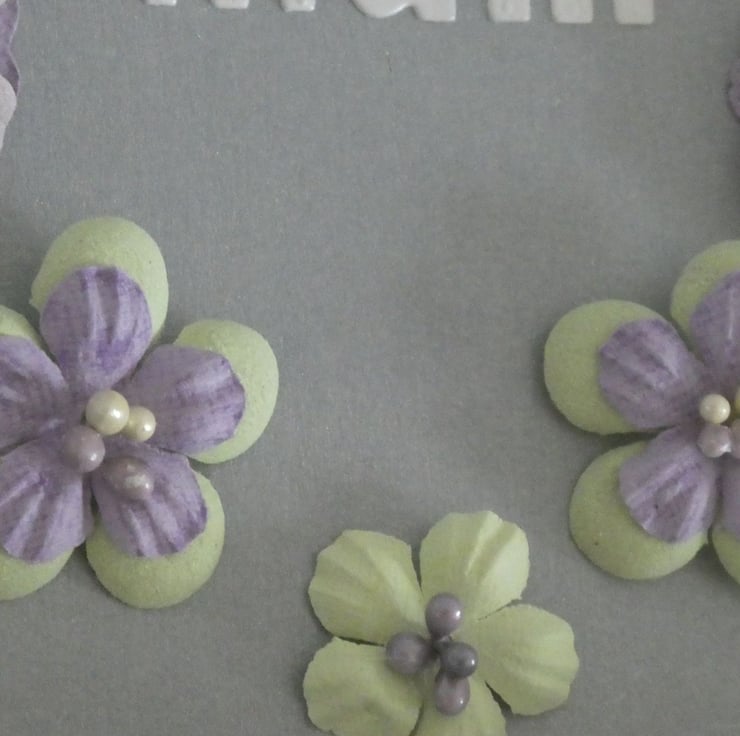 Ideal as a gift for a Birthday or Mother's Day this white painted box frame contains a heart shaped arrangement of paper flowers in shades of purple, lilac & green on a pearlescent grey background.