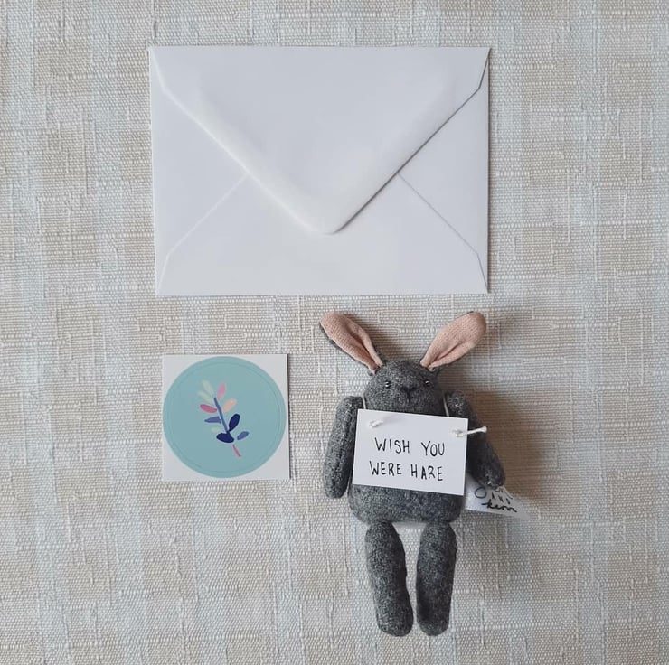 The rabbit is 10cm tall, with a note around his neck saying 'Wish you were hare'.