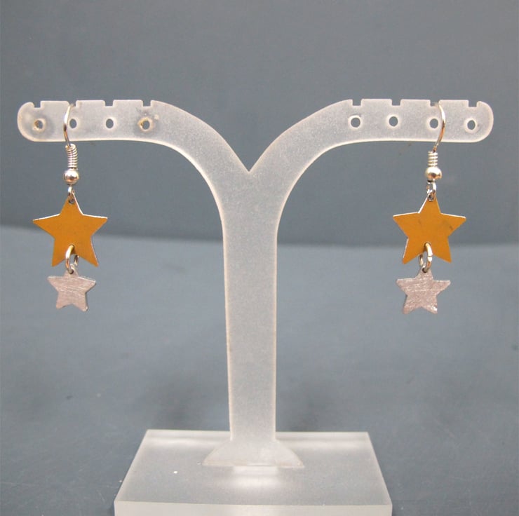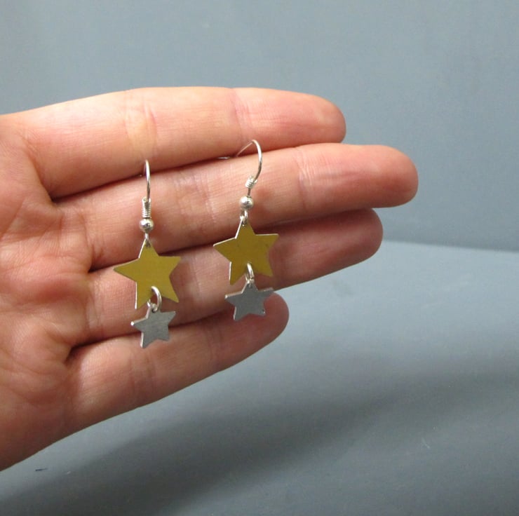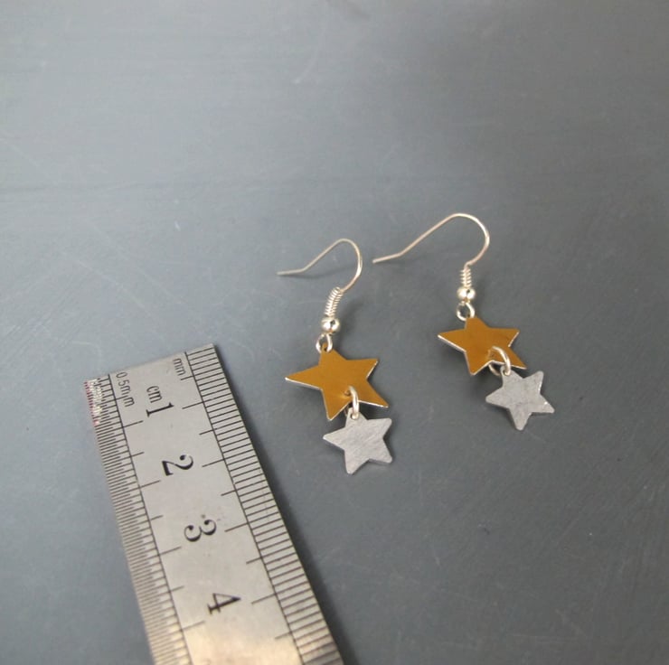 Anodised aluminium star earrings featuring a larger gold aluminium star and a smaller silver aluminium star hanging underneath it. The earrings are incredibly lightweight and have a shimmer of movement when worn.