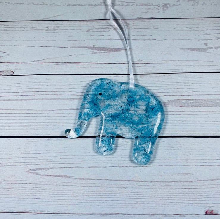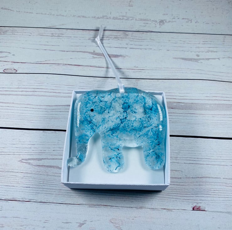 Cast glass elephant which has tiny blue bubbles encased within it . It’s so pretty and unique and would make a lovely gift for a christening or a lover of elephants .