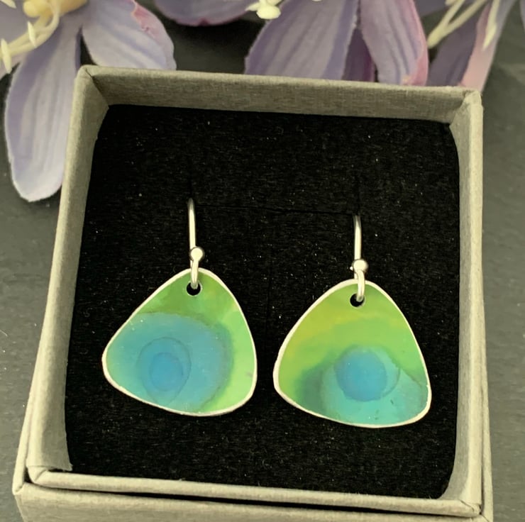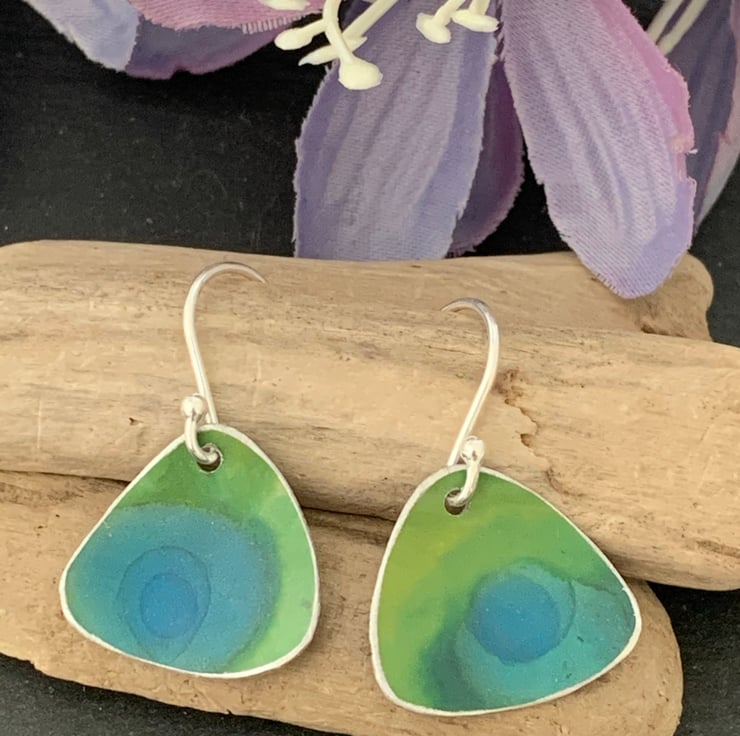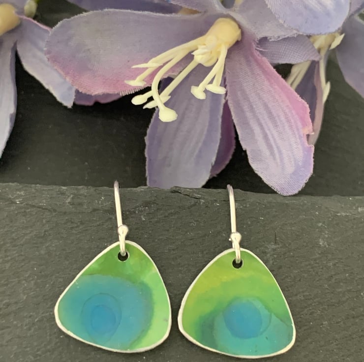 Sterling silver and hand dyed/printed aluminium earrings.