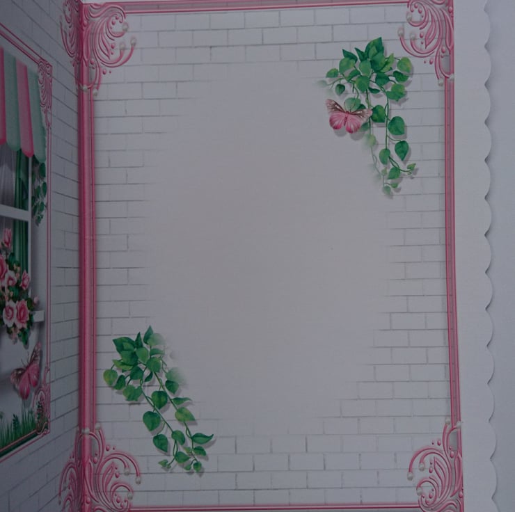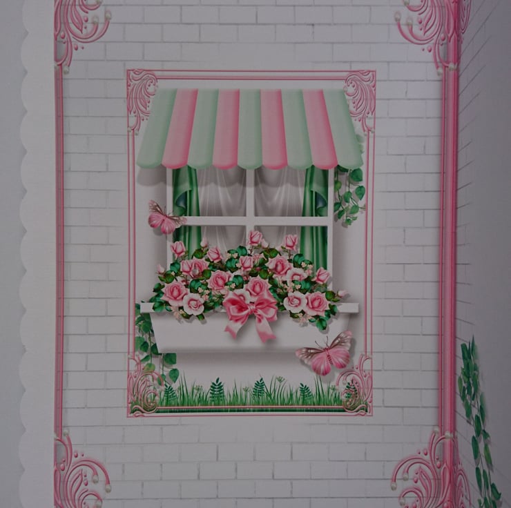 The design is a beautiful window box with an awning on the side of a lovely house. It is full to the brim with pink roses and butterflies are fluttering in and out. Can you imagine living here?