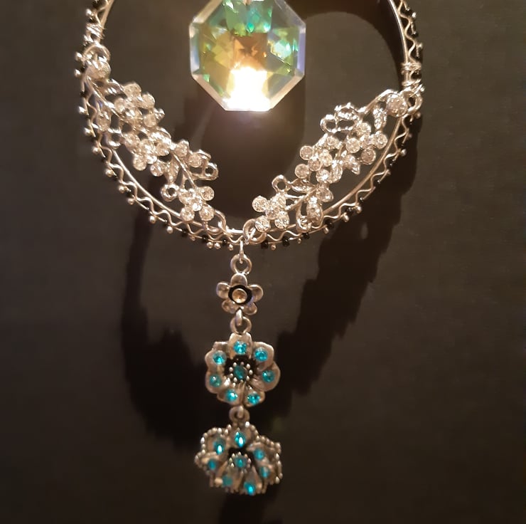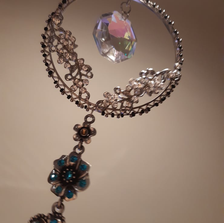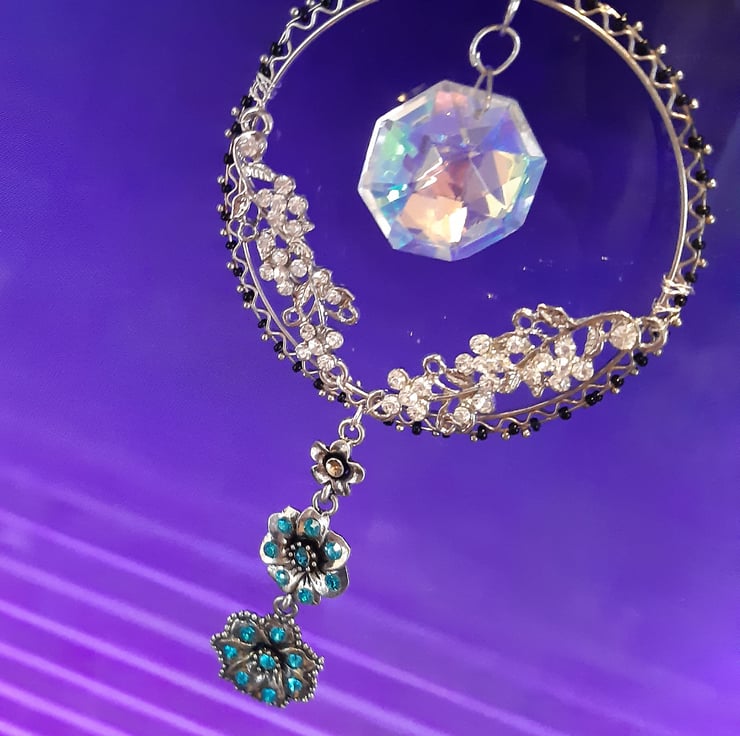 Hand made recycled jewellery and other metal materials to make this sun catcher mobile, in the metal bangle hangs a lovely clear crystal , a pretty array of colours when the light catches it .