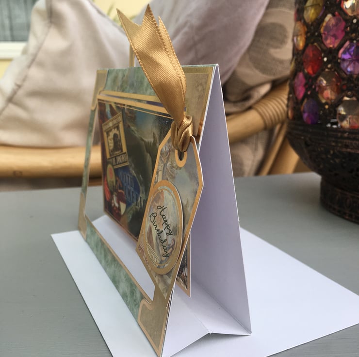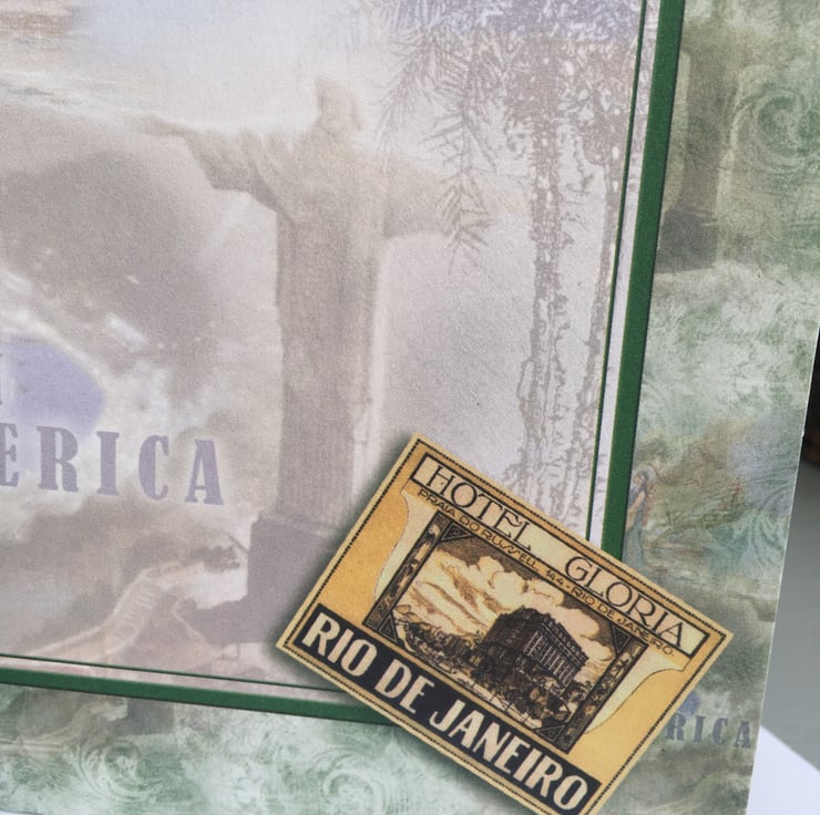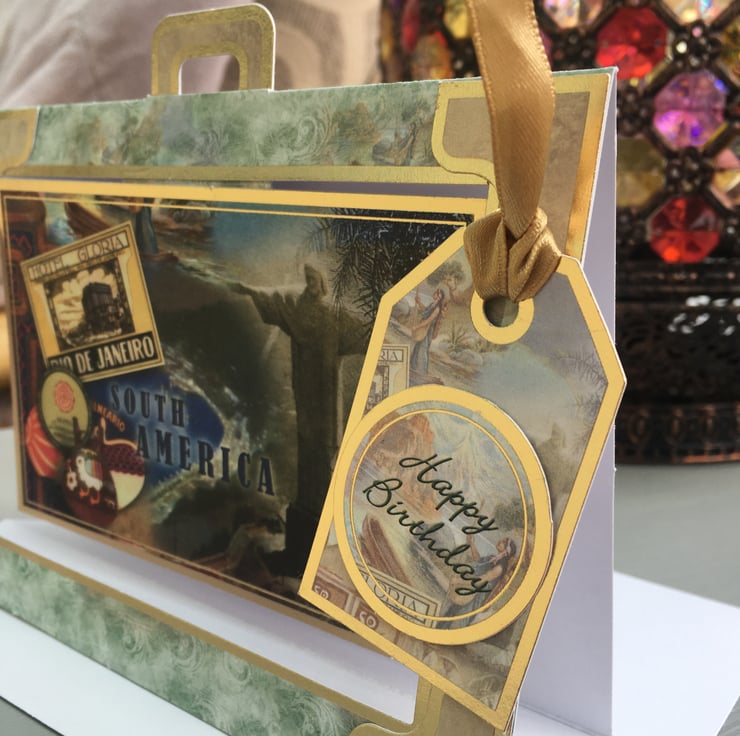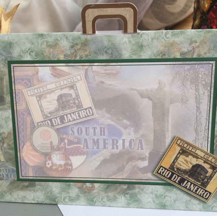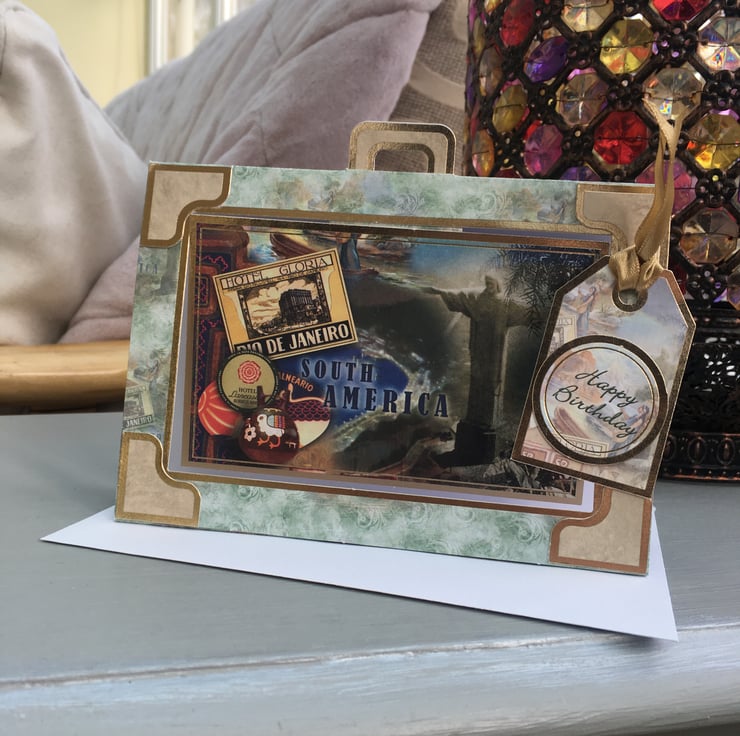 An unusual shaped 3D card. This 15x10.5cm card is in the shape of a suitcase, complete with handle. The front is open and has a south American themed picture which dangles inside. The card concertina's at the base but folds flat. The pictue has south American themes with Christ the redeemer as the main feature. There are various other pictures of hotels, art and stamps. There is a tag with Happy Birthday on it on the side.