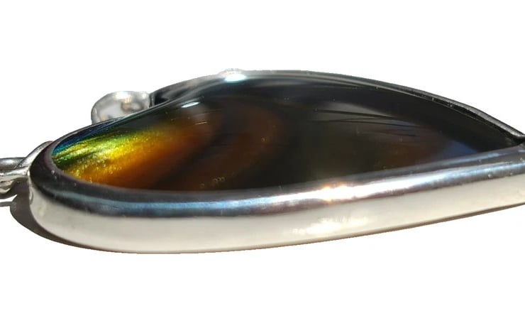 Made from years and years of build-up, this paint has now hardened sufficiently to be cut and polished. Lapidarists slice them up into pieces and shape them so that all the layers of colour can be seen. Jewellery makers then buy these smaller pieces to incorporate them into one-off pieces of jewellery for you!