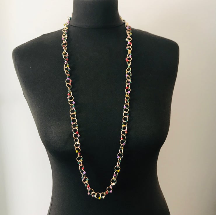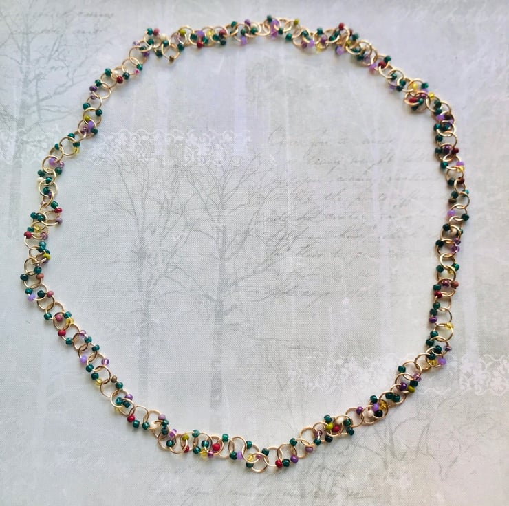 Beaded link necklace. Handmade chain with green Picasso seed beads & mixed red, maroon, green & purple seed beads. No fastening just goes over head. Measures approx 98cms.
