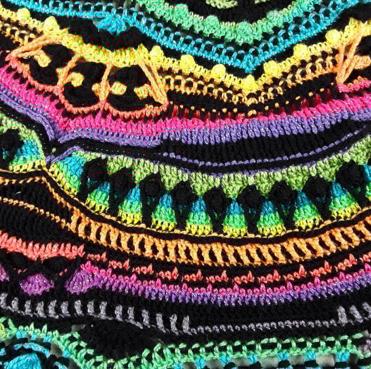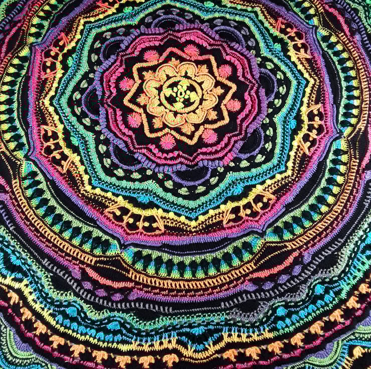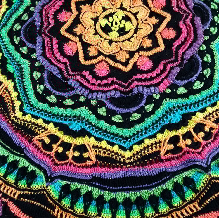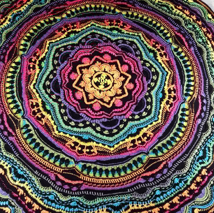 Looking to add some vibrant flair to your space? Check out our Large Circular Crochet Mandala Throw, perfect for a double bed. This stunning blanket showcases the art of crocheting with a blend of black yarn and glimmering multicoloured yarn. Featuring a spectrum of yellow, orange, pink, purple, green, and blue hues, it creates a mesmerising effect.