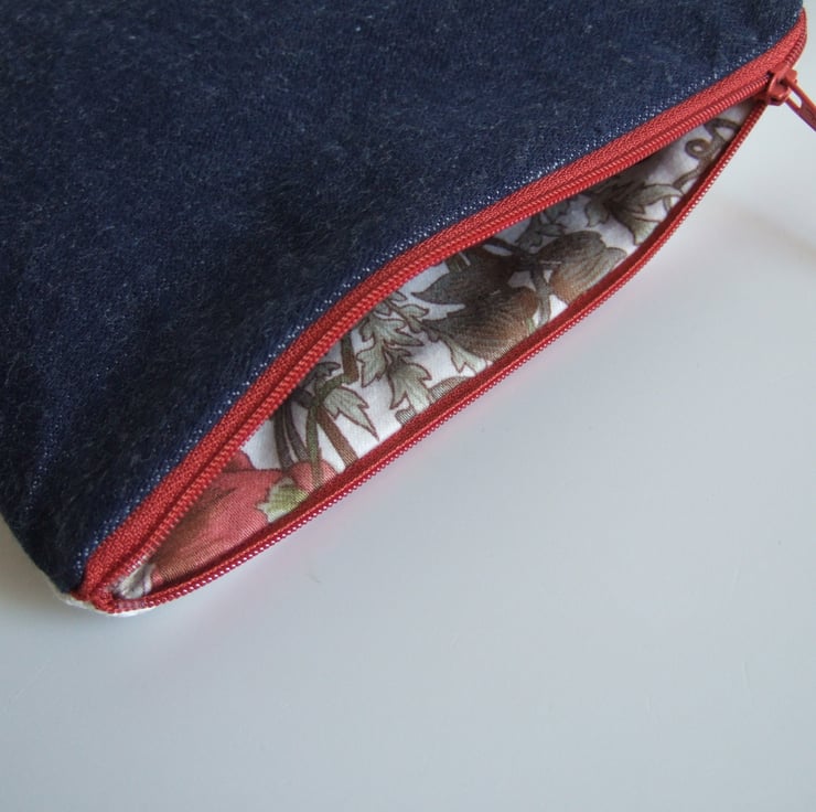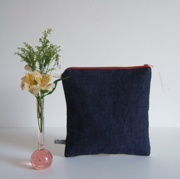 It measures 20 cm across and 20 cm down, and closes with a russet 20 cm zip. The back is made from recycled brushed denim to give it some edge.