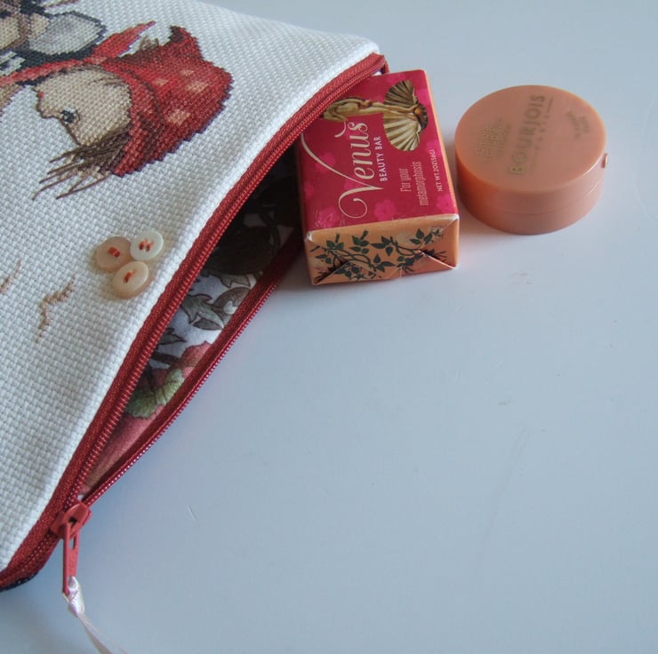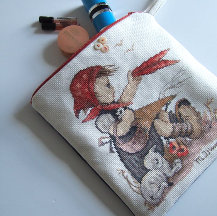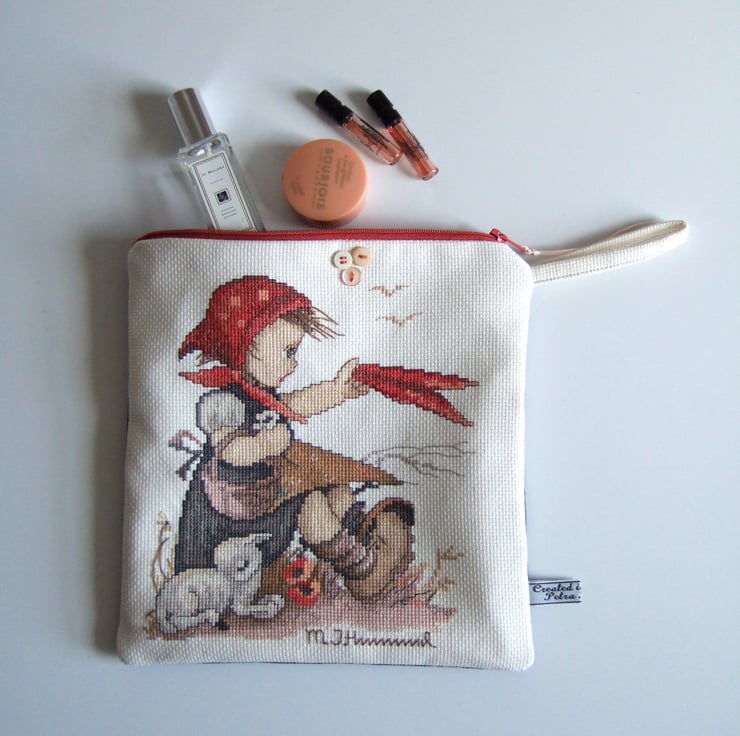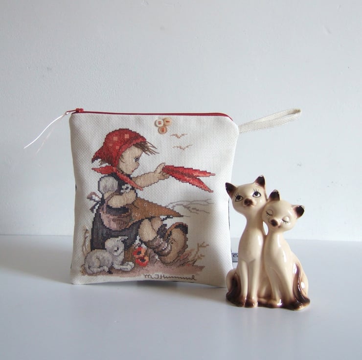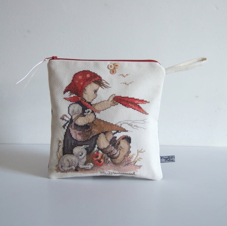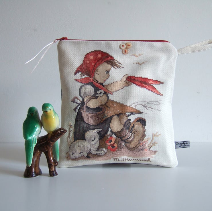 This little make up or storage bag, is made from a beautifully worked vintage cross stitch sampler. It features a cute spring time design of a little girl with a lamb. This was designed by Hummel, and the name is embroidered along the bottom seam. Hummel designed plates with romantic designs of children, particularly in the 1970’s, and this is a classic of one of those designs. It would make a lovely present for a lover of vintage fabrics, perhaps for someone learning to embroider, or for a little girl on her Birthday to store her precious things in.