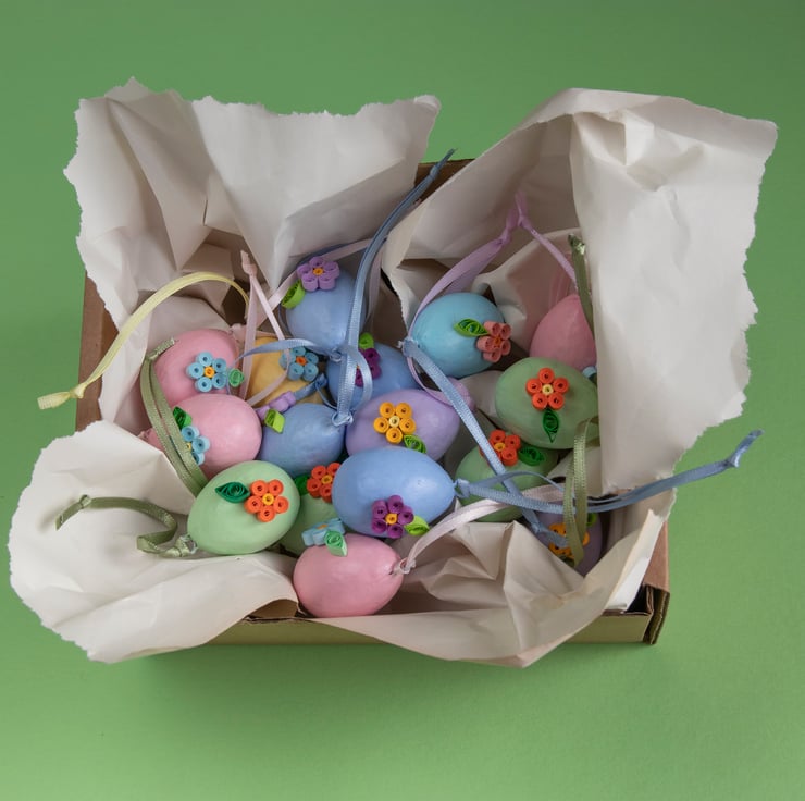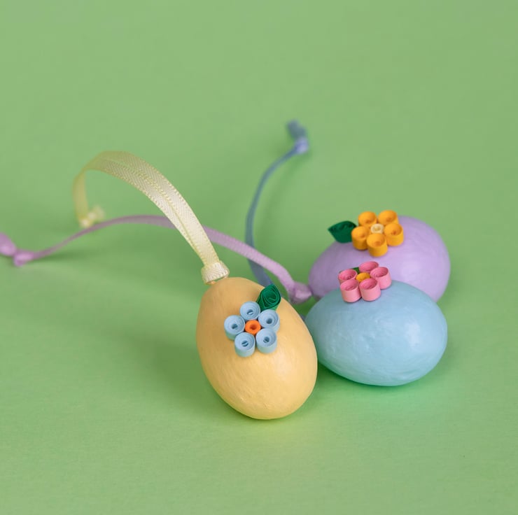 This set of three pretty pastel Easter egg decorations looks good enough to eat but they're made of paper mache not chocolate! They each have a cute little quilling flower and a complementing colour of ribbon to hang on - perfect for Easter or just to add a little springtime prettiness to your home.