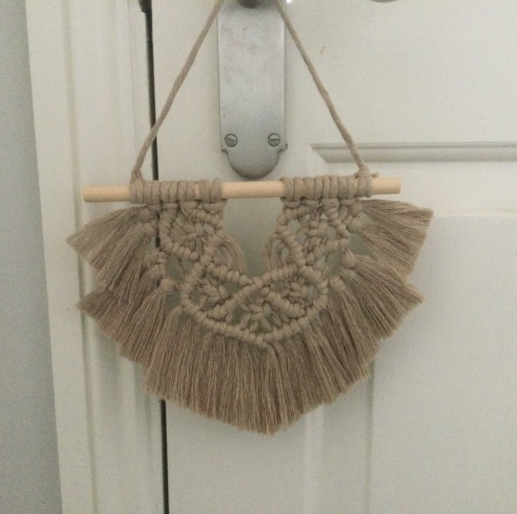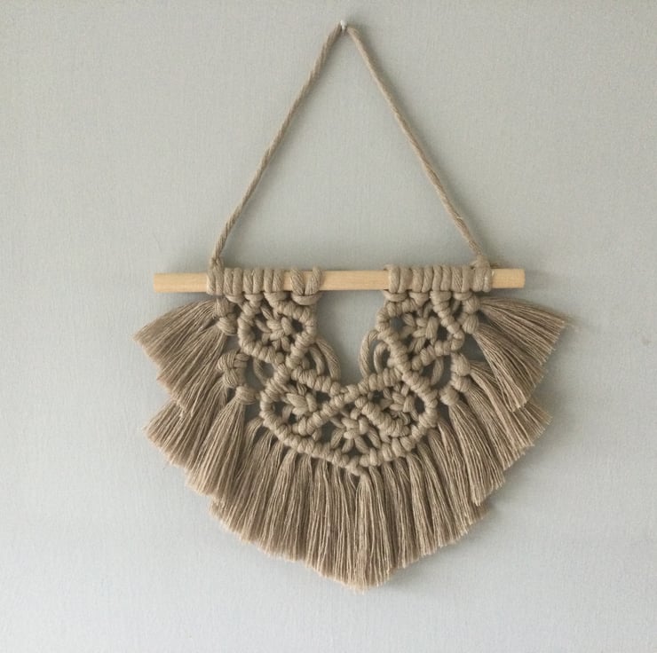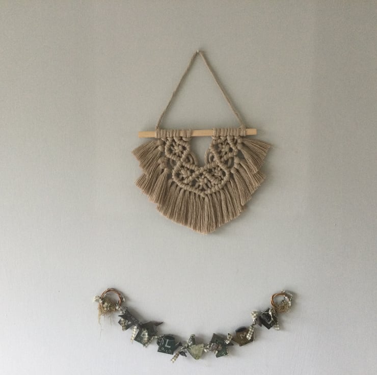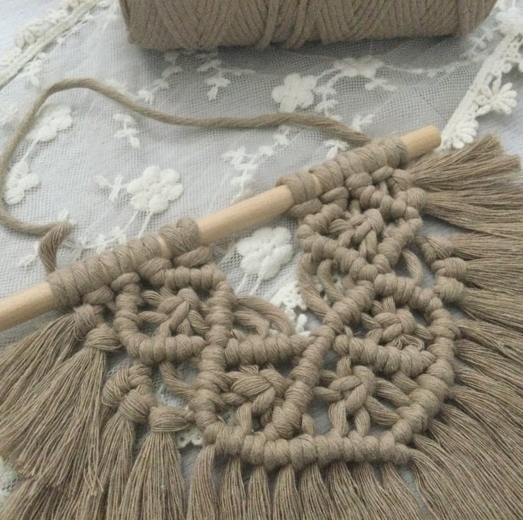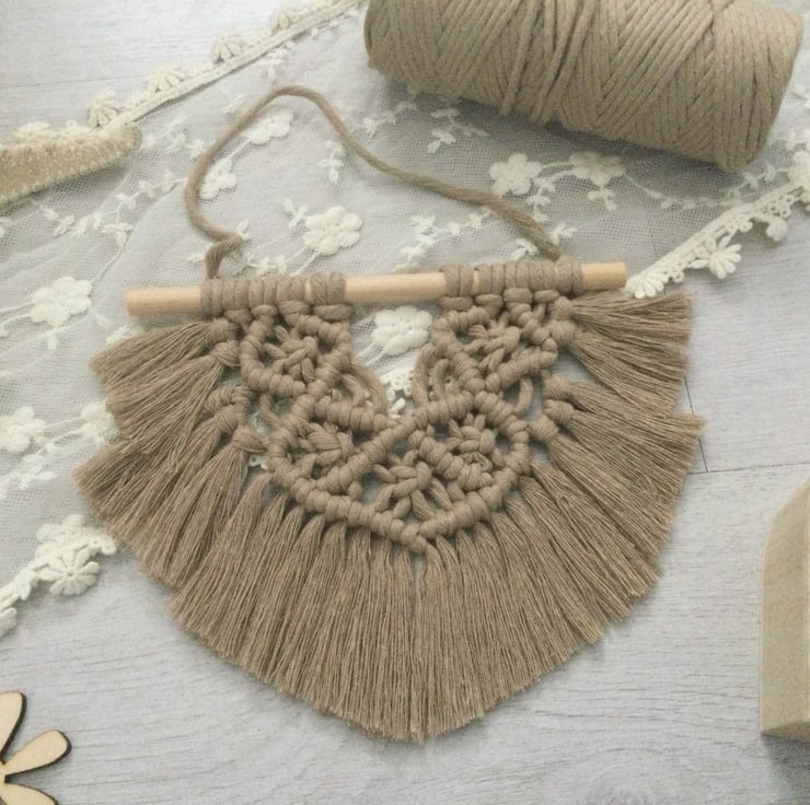 Add some texture and warmth to your home with a beautiful hand woven macramé wall hanging. Created with my favourite Bobbiny macramé thread which is 100% recycled so kind to the environment It is beautifully soft and makes a lovely full fringe when brushed through a real pleasure to work with. A wall hanging can make a super gift to newly weds setting up a new home or for a baby’s nursery or playroom.