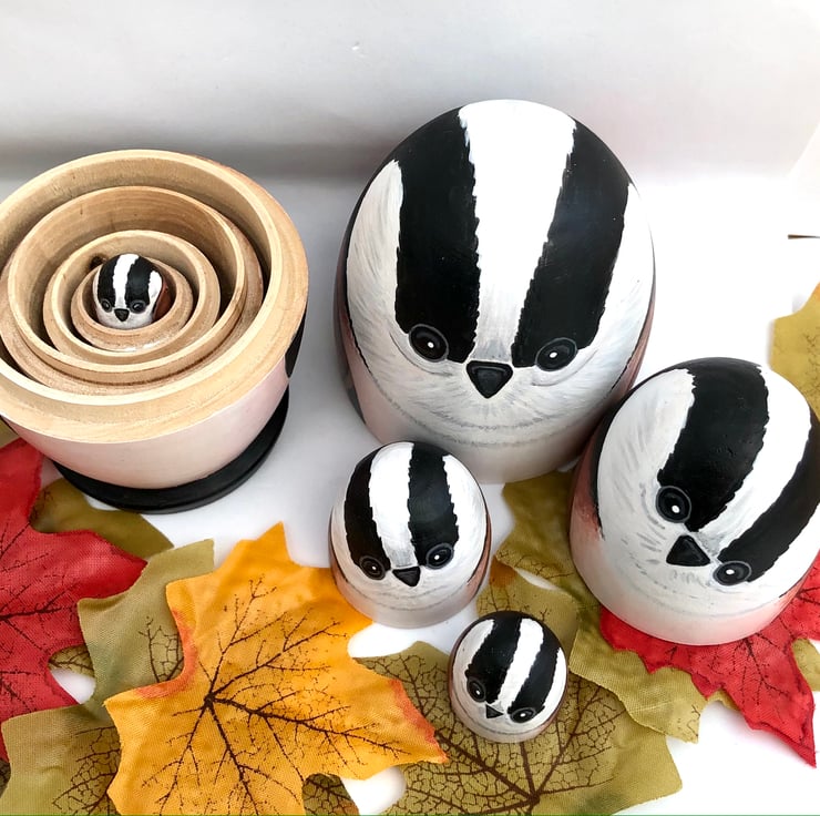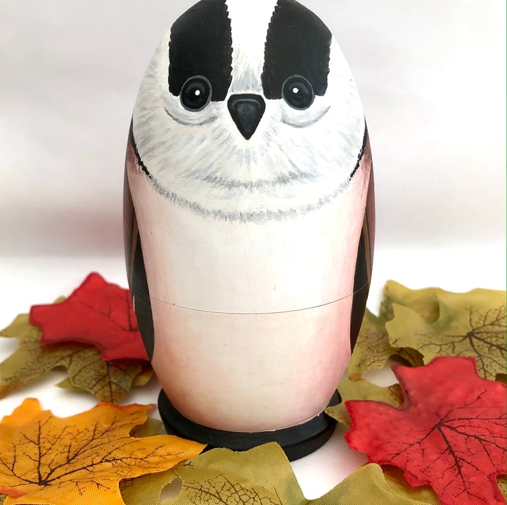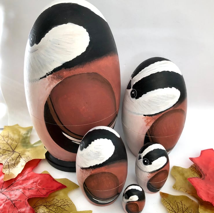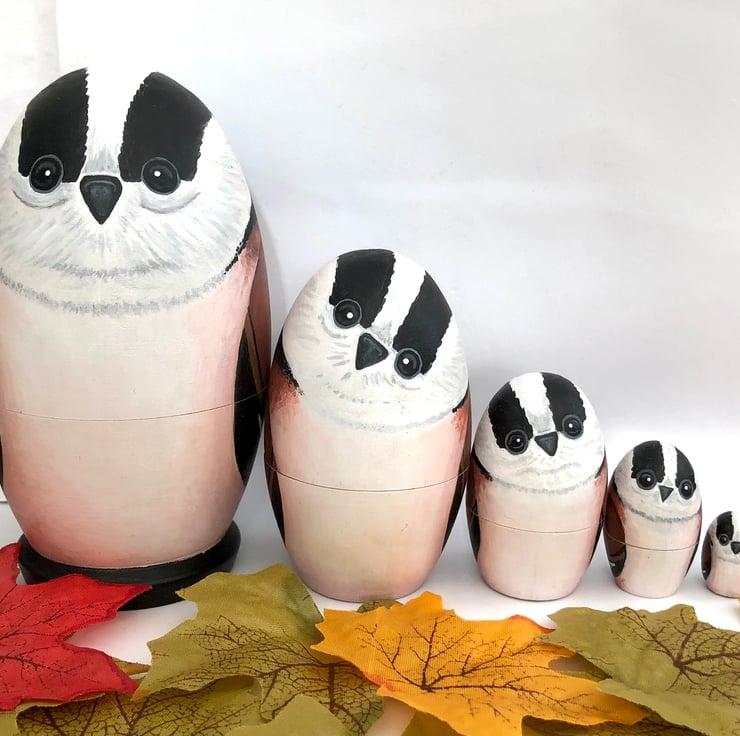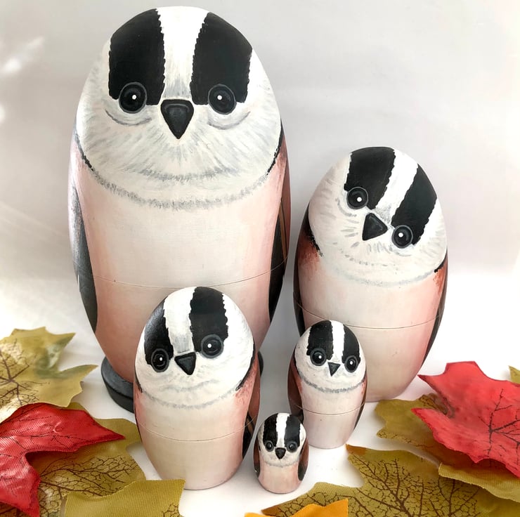 Here is a family of Long-tailed tit bird nesting dolls.