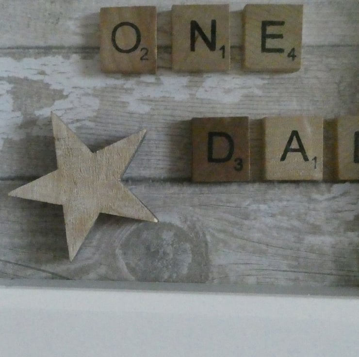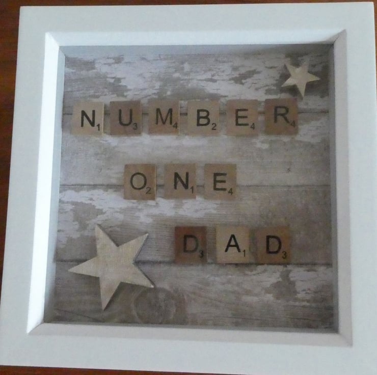 Ideal as a gift for a Birthday or Father's Day this white painted box frame contains the 3D message 'Number One Dad ' in letter tiles on a whitewashed wood effect background.