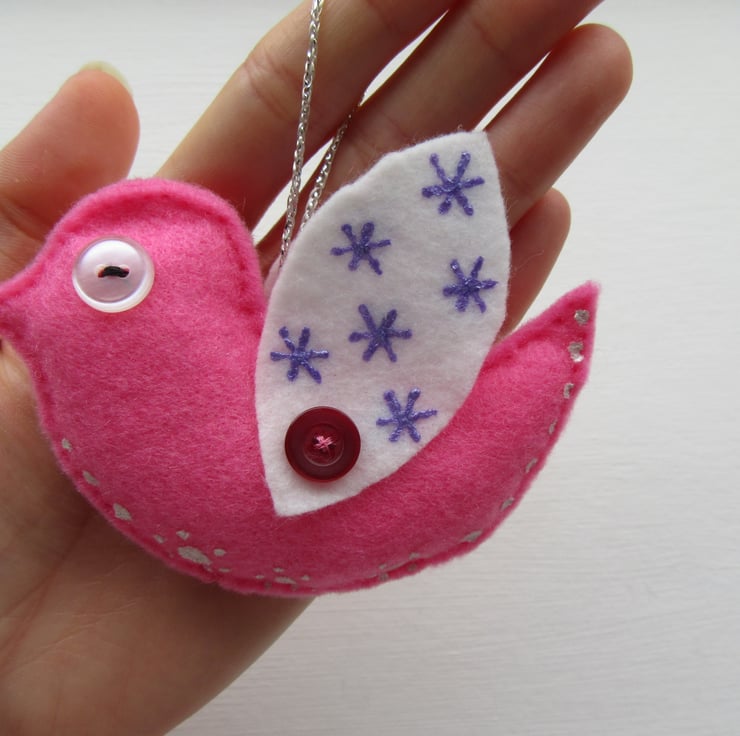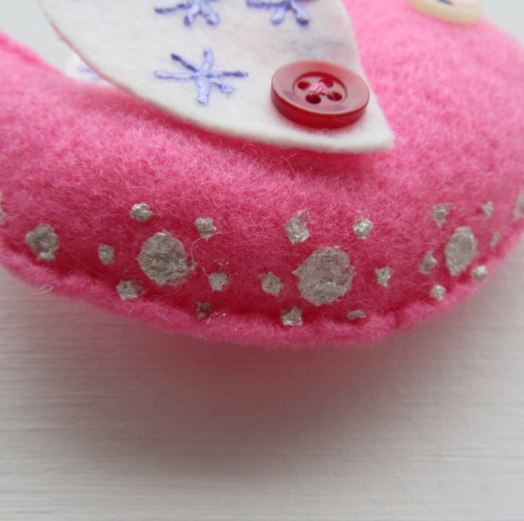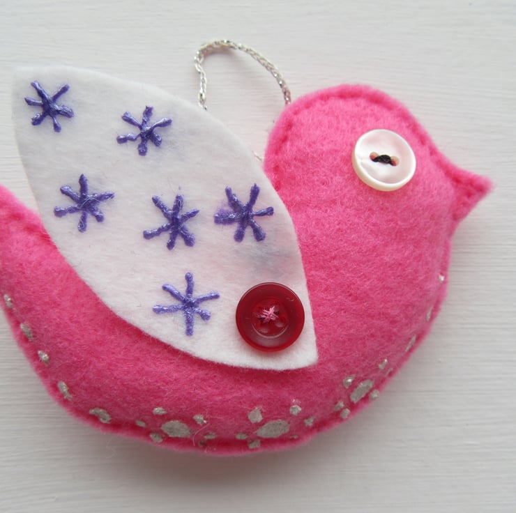 Hand-cut and stitched by me. This cute little bird has a pink acrylic felt body and white felt wings. The wings are attached by dark pink buttons, with translucent button eyes, all saved from old clothes.