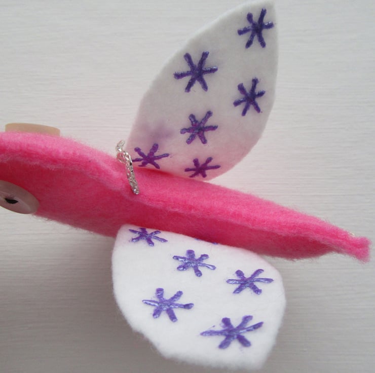 The wings and body are decorated with fabric paints in purple and silver respectively.