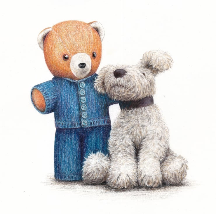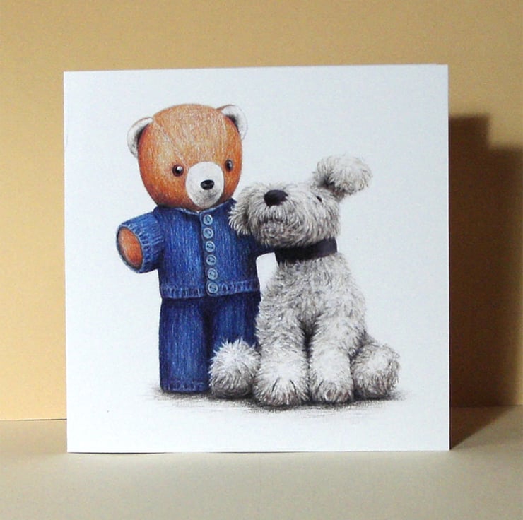 ‘Teddy Bears No.2’ - This card is a reproduction of one of my original coloured pencil designs. Two stuffed toys are sitting for their portrait. Standing up is Smallbear. He is a bear I have known for many years and he insisted on wearing his new bright blue knitted outfit for his picture. Beside him is Colin the Dog. You will, unlike Colin himself, have spotted that he is not a bear, but this does not seem to bother him unduly.