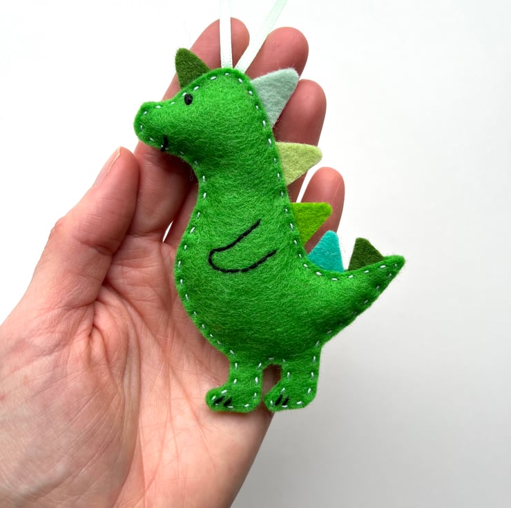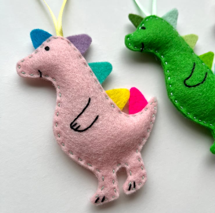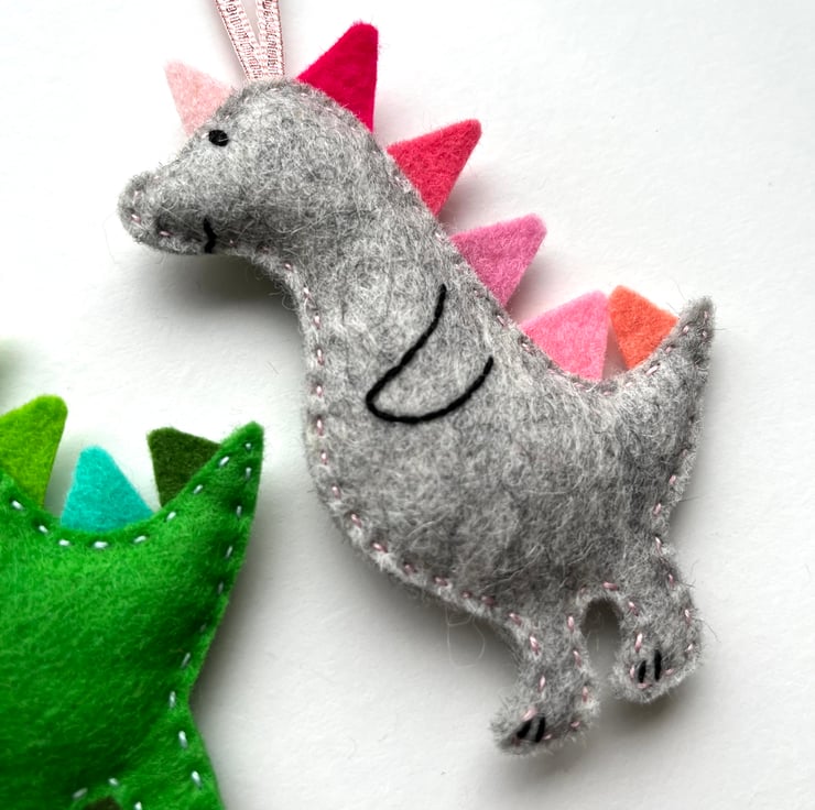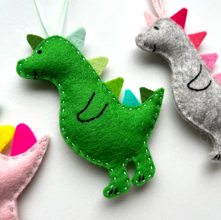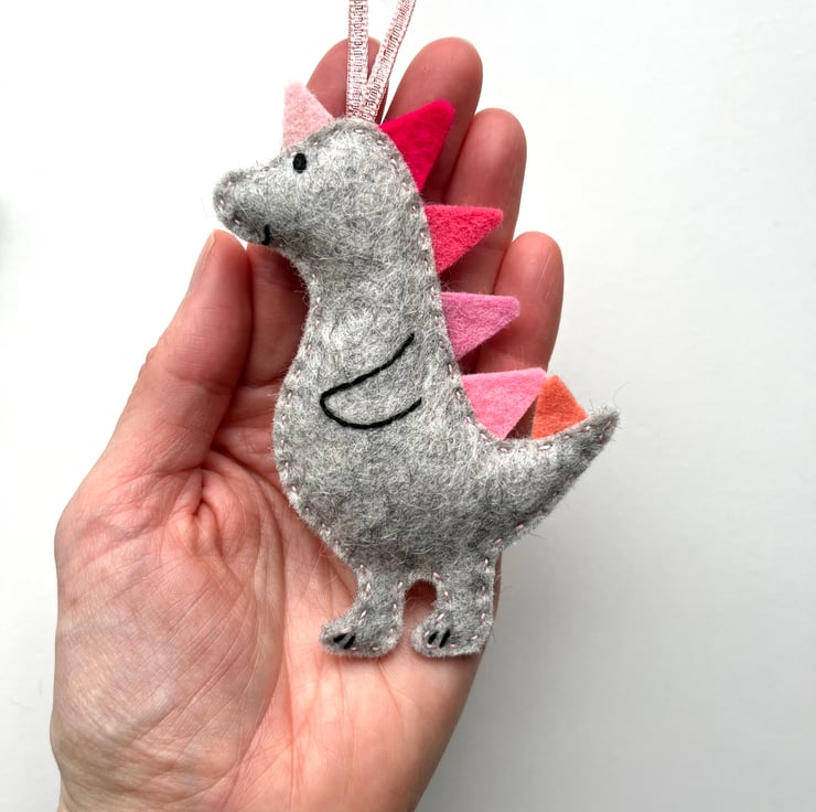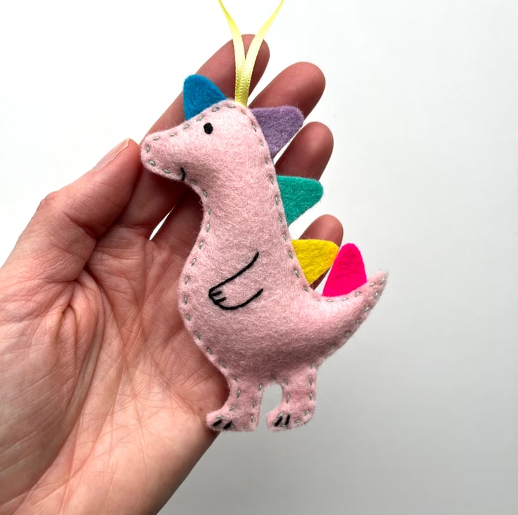 Each dino is completely made by hand using wool felt. It starts as an original drawing, which is then turned into a template. It is hand cut, in soft and strong 100% wool felt. Multi couloured spikes run down the dinosaur’s back. The face and body details are hand stitched, the the two parts sewn together by hand. Homegrown organic lavender is added as the dino is sewn up, and a ribbon attached so it can be hung up straight away.