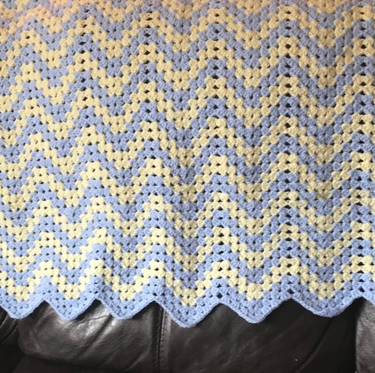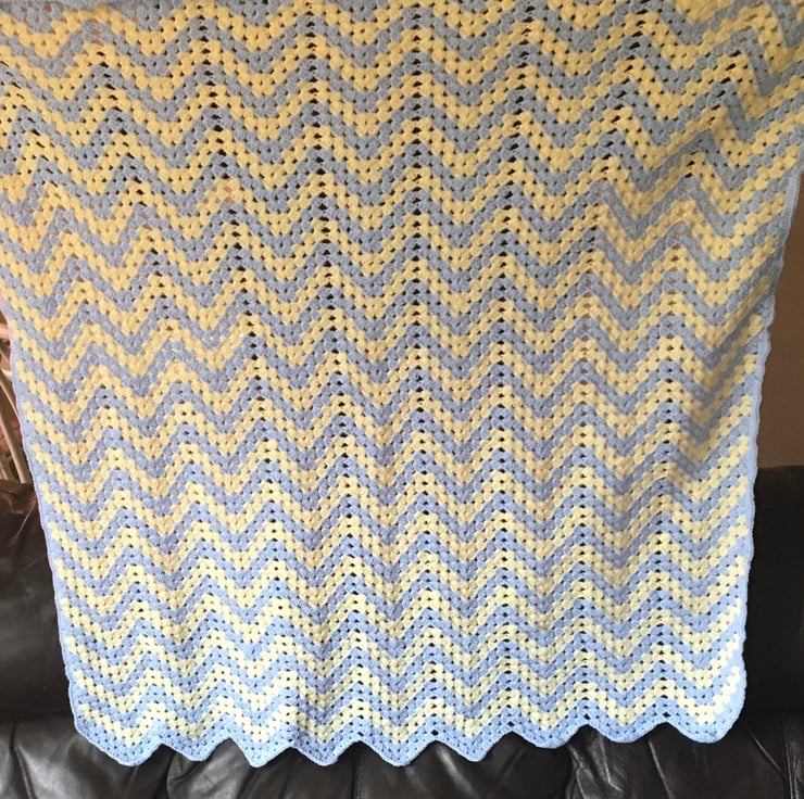 Crocheted in lovely soft dk yarn. This gorgeous blanket is made in zig zag pattern. Blue edging.