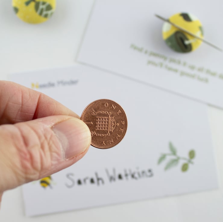The needle minder is perfect as gift for craft makers and anyone who loves sewing and cross stitch. Each pin minder is sent on a presentation card, and held in place by a lucky penny on the reverse which can be used for securing the magnet on your embroidery project. It's also wrapped in a compostable bag and posted in a hard backed envelope for safe postage.