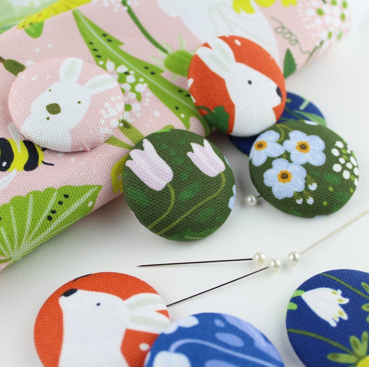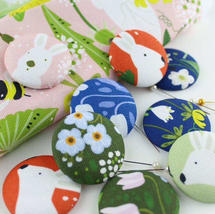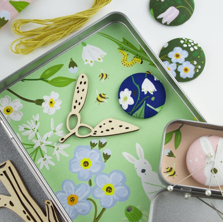 Magnetic Needle & pin minder, covered in our designed fabric that features bunnies bees bears and lots of woodland wild flowers. This needle minder features a pretty forget-me-not flower, illustrated from one of my walks around the woodland in Yorkshire.
