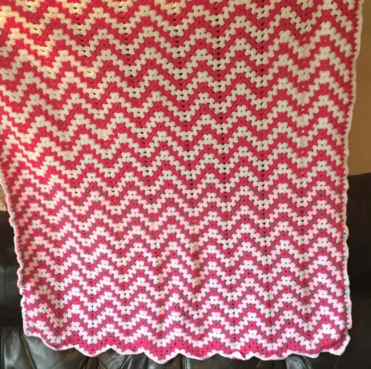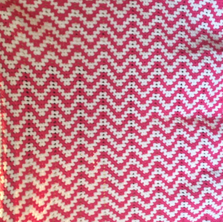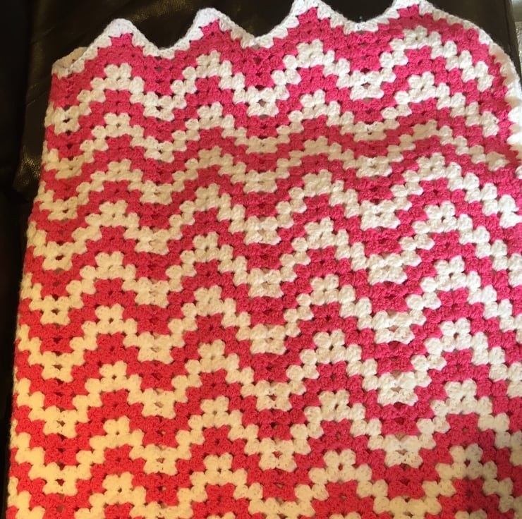 Crocheted in lovely soft dk yarn. This gorgeous blanket is made in zig zag pattern. White edging.