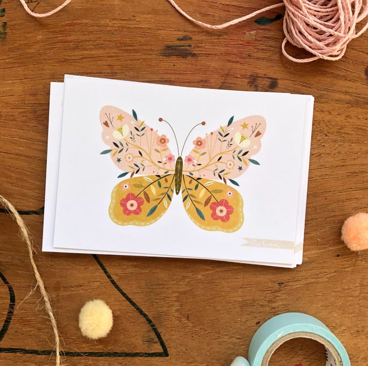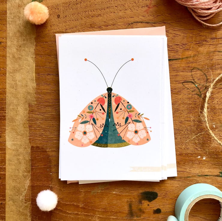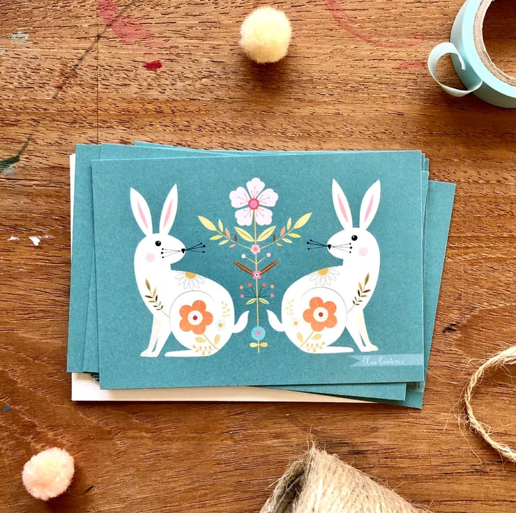 The postcards depict 2 decorative moths, a butterfly and floral spring bunnies, all with a folk feel to the illustration. The cards are blank on the other side for your own personal message.