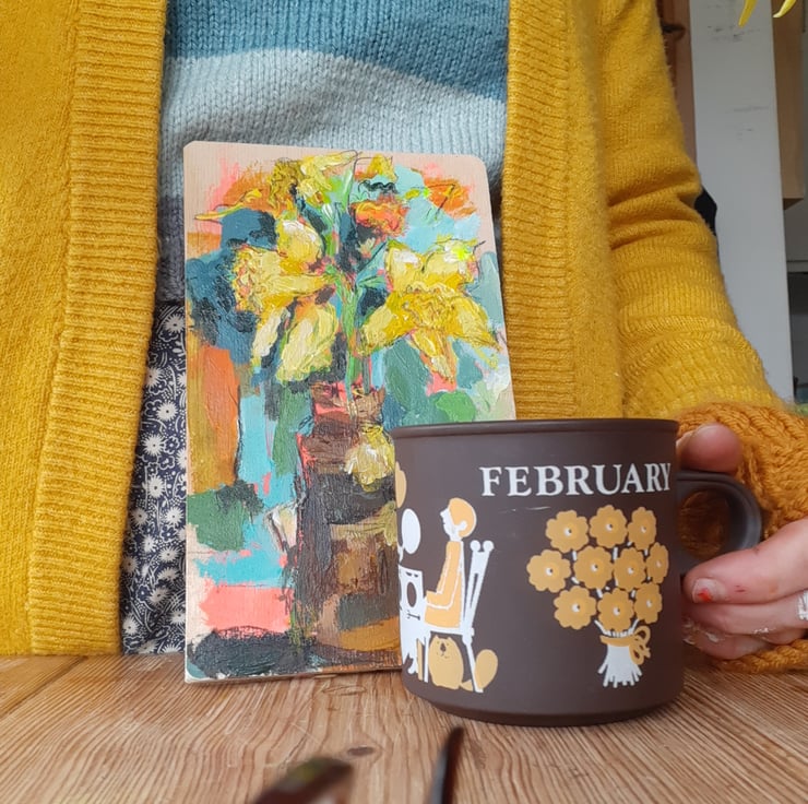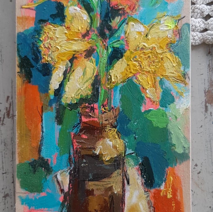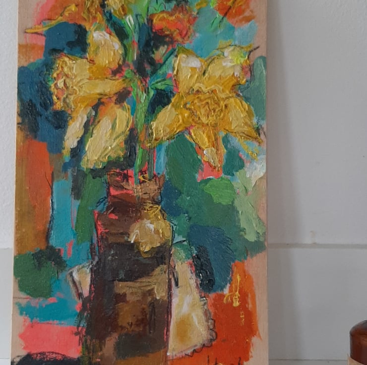A contemporary still life painting by artist Hesta Singlewood aka bodkincreates on Instagram. This vibrant small painting on reclaimed wood is in her signature style. Full of movement and colour contrast. Measuring 20 cm tall and 12 cm wide .hook on the back ready to hang . It is rich in texture and has a light seal varnish. Celebrating the first of the daffodils.